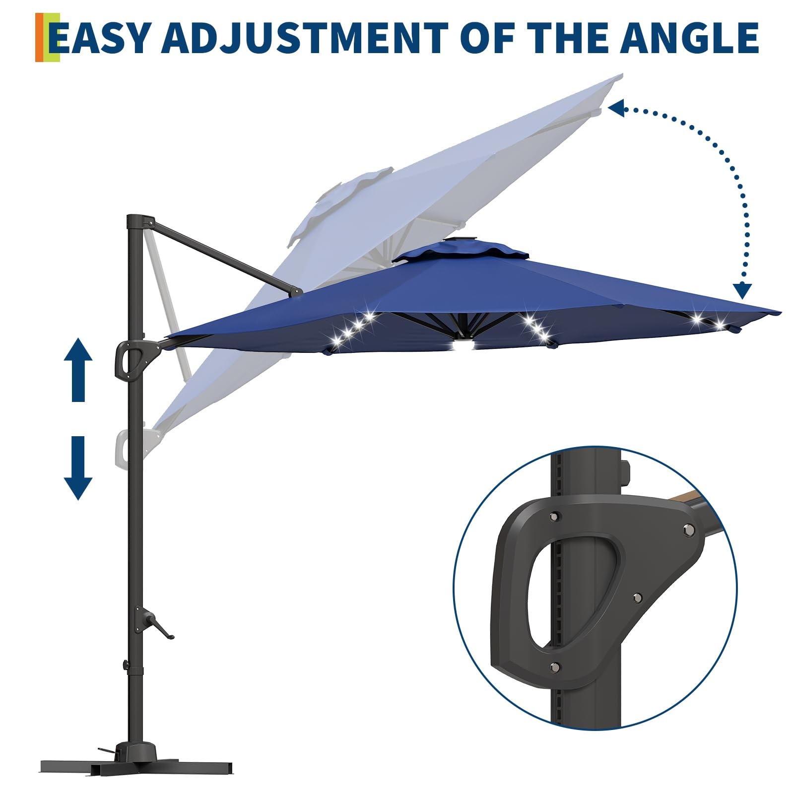 Navy Blue 10FT Cantilever Patio Umbrella with Solar LED and Base, Round Top