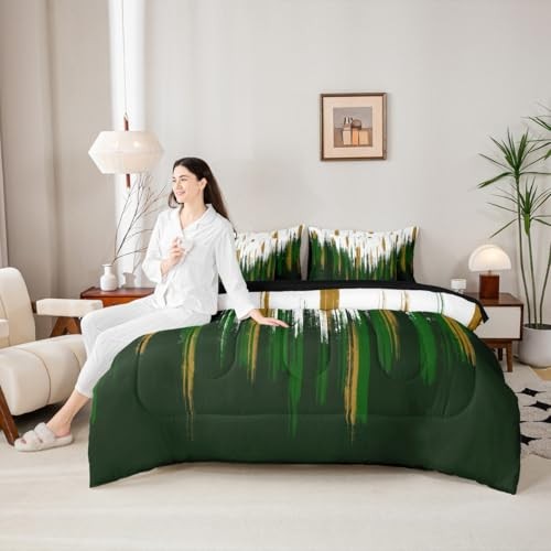 Comforter Set 7 Piece for Kids Adults,Modern Oil Painting Queen Dark Green