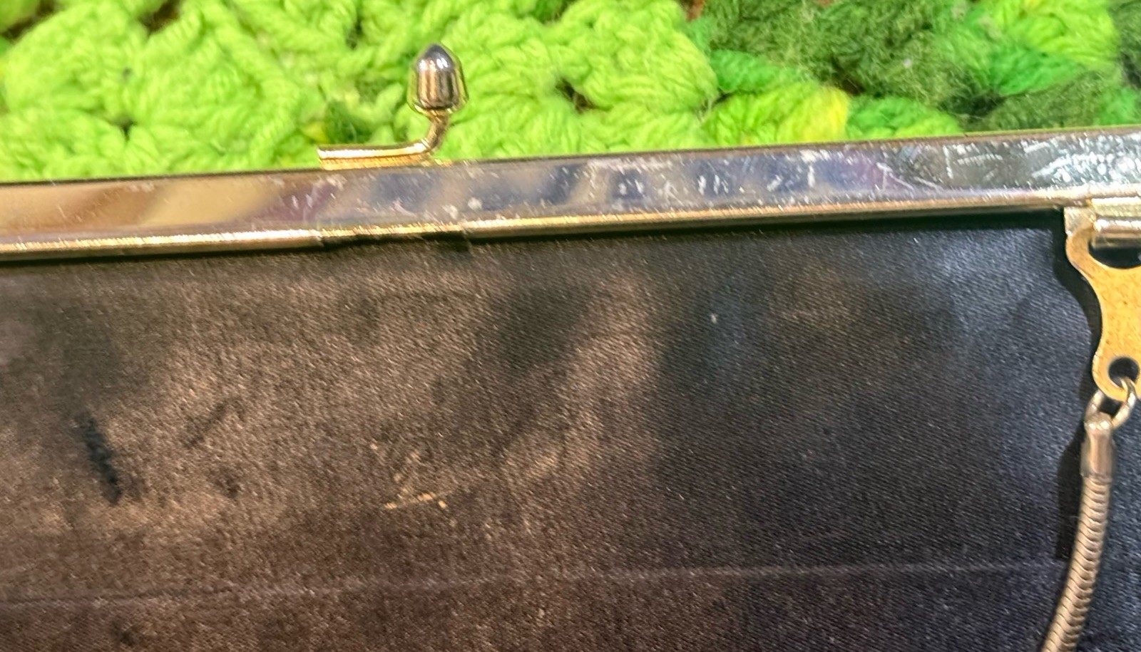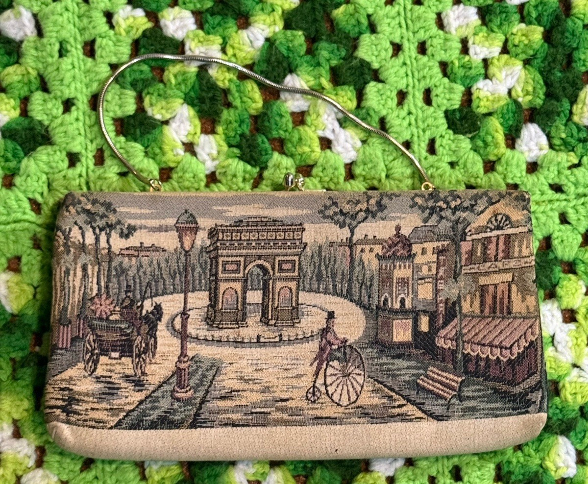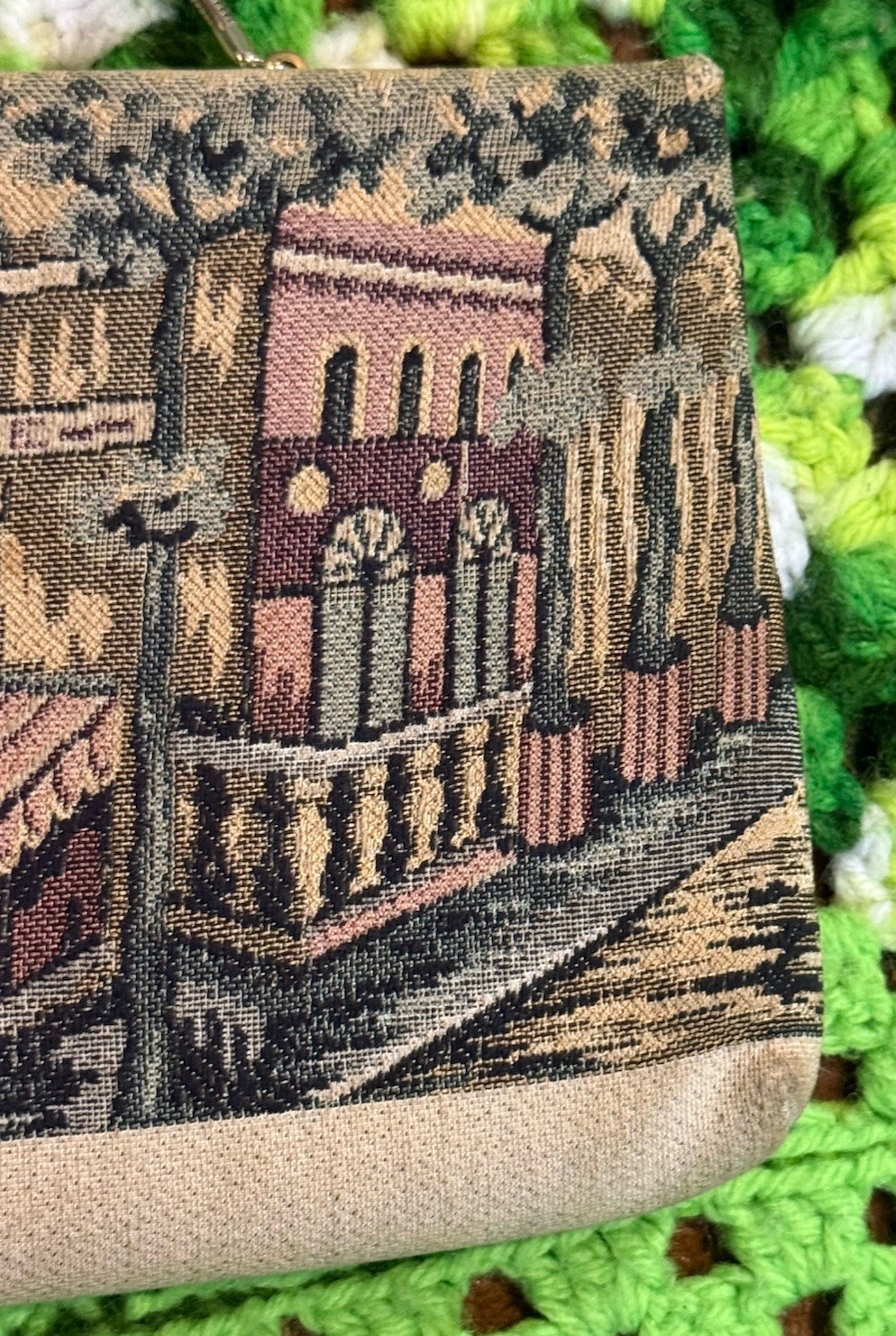 Vtg Tapestry NeedlePoint Kiss-lock Clutch Handbag Cityscape Purse Boho Classic