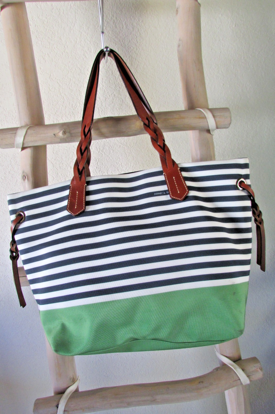 DOONEY BOURKE L GREEN CANVAS BLK WHITE STRIPES CANVAS TOTE BROWN LEATHER STRAPS