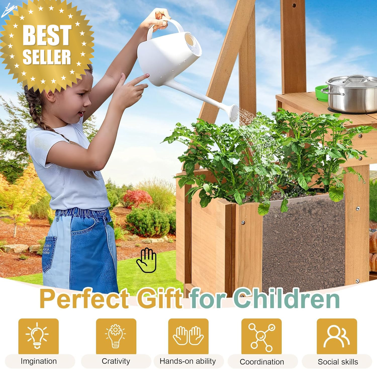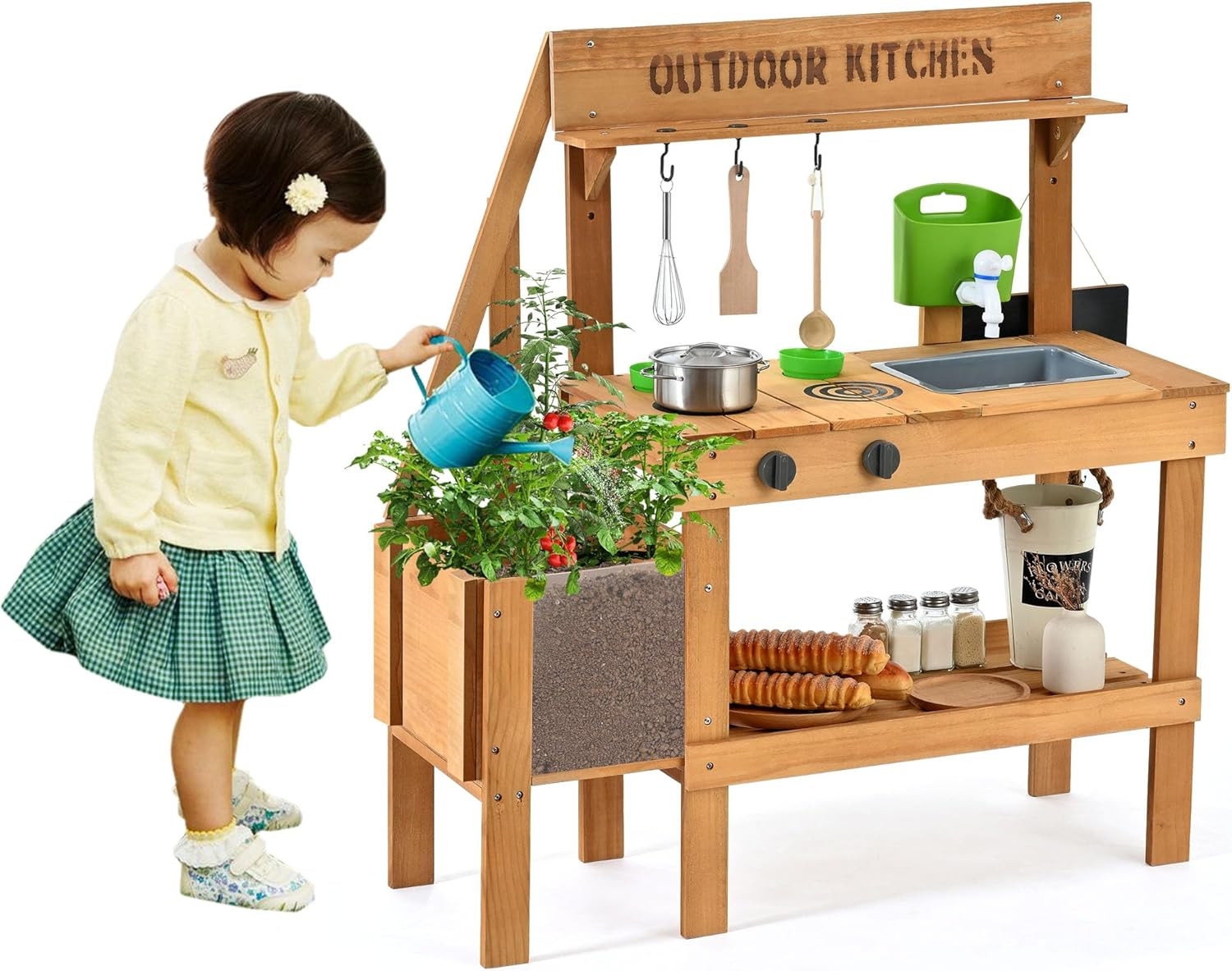 Outdoor Mud Kitchen for Kids Wood Playset w/ Sink, Planter, Faucet Chalkboard