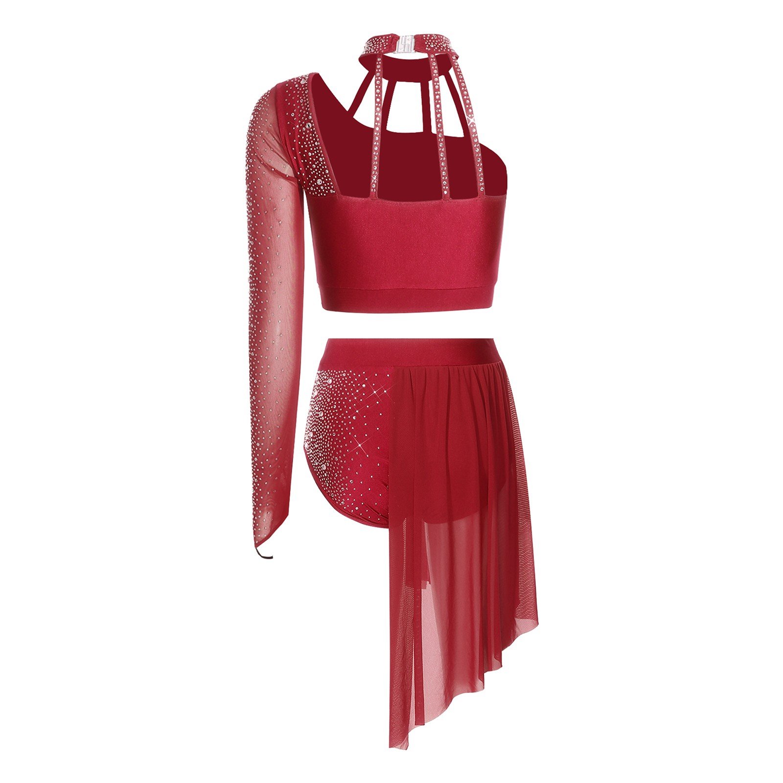 Womens Dancewear Rhinestone Dress Dance Outfit Mesh Latin Contemporary Hem Back
