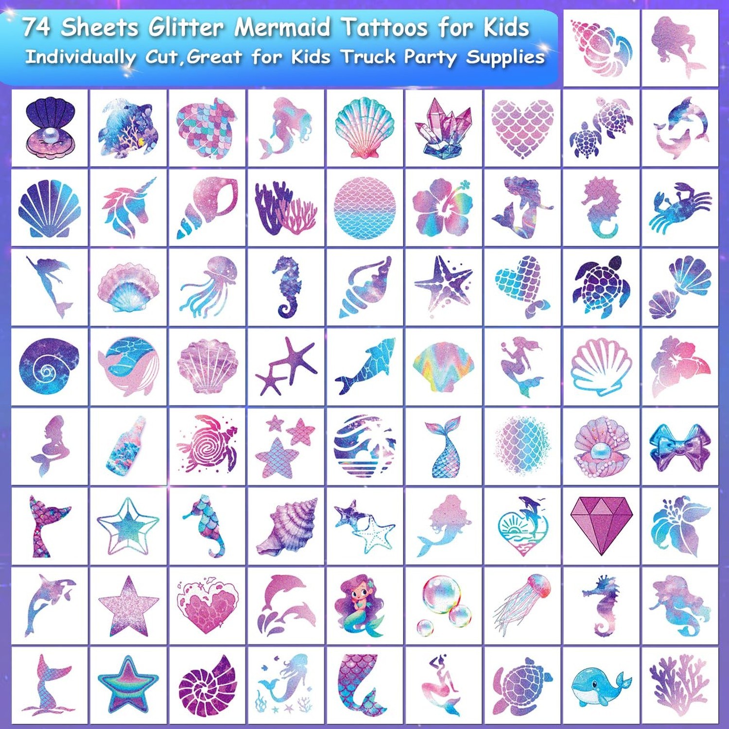 Glitter Mermaid Temporary Tattoos for Kids - 74 Individually Sheets Glitter T...