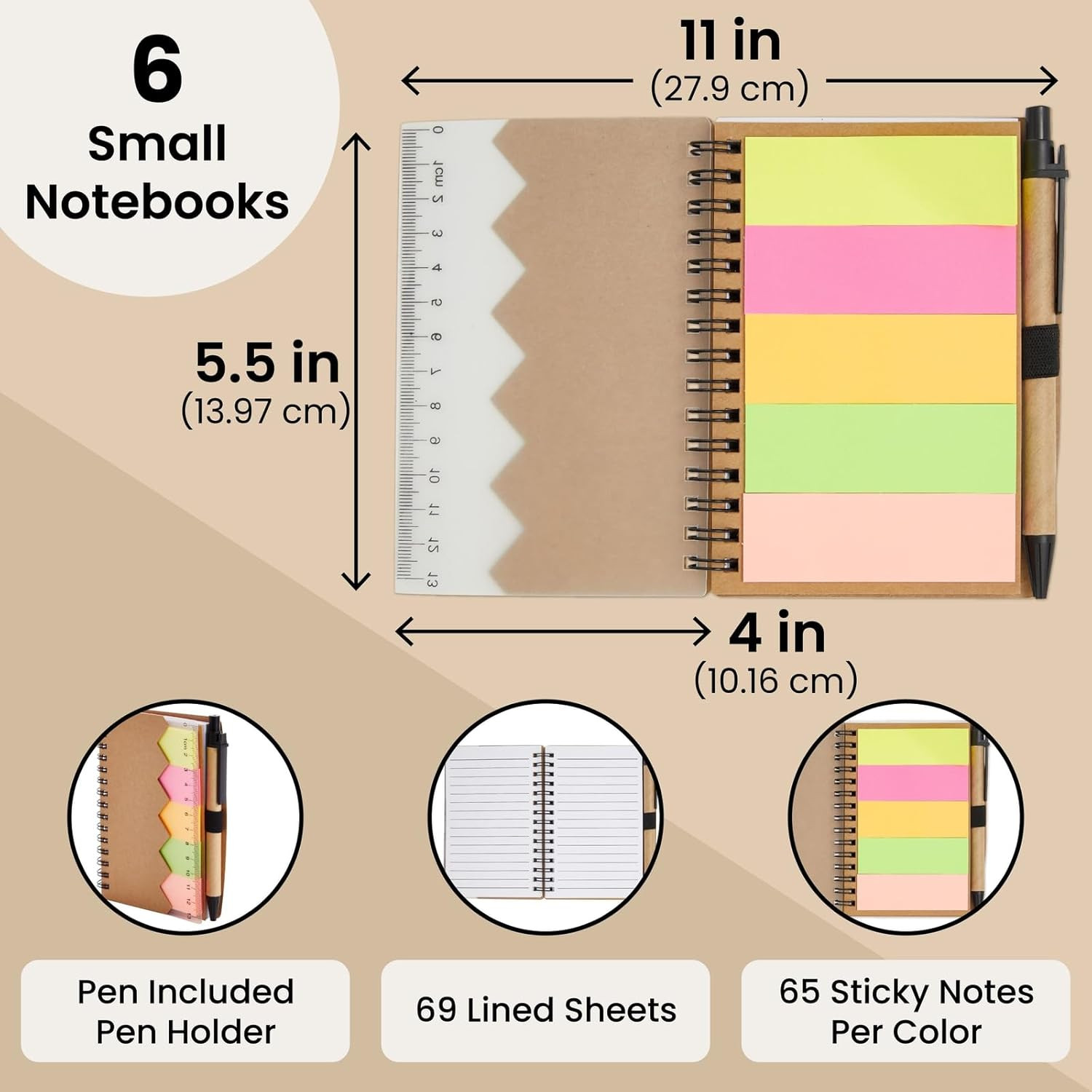 School Supplies Pocket Notebook Pen - 4 X 5.5 In, Brown Cover, 6-Pack - Lined