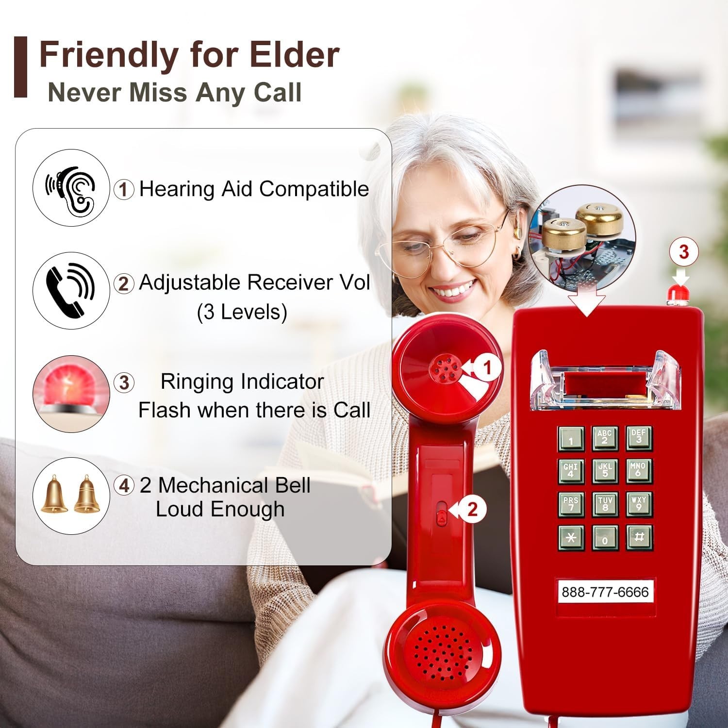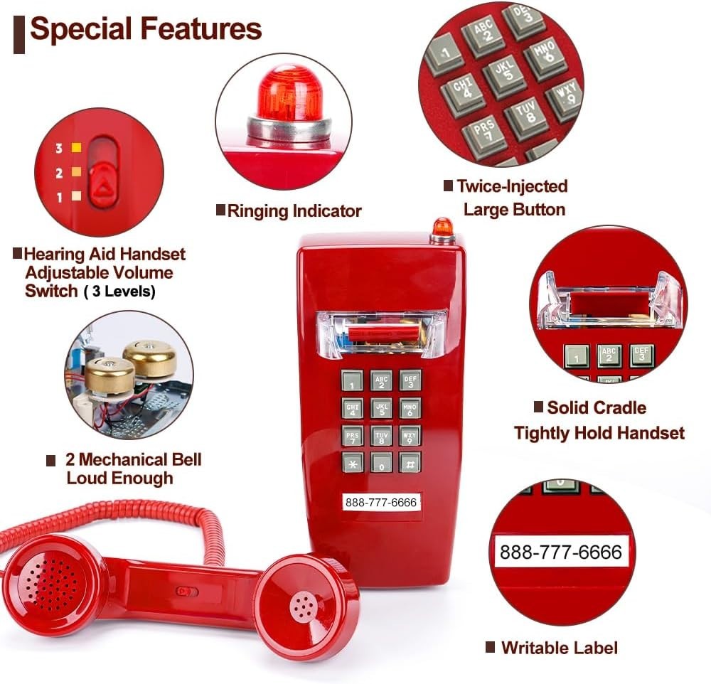 Hearing Aid Compatible Red Wall Telephone - Emergency Backup Landline