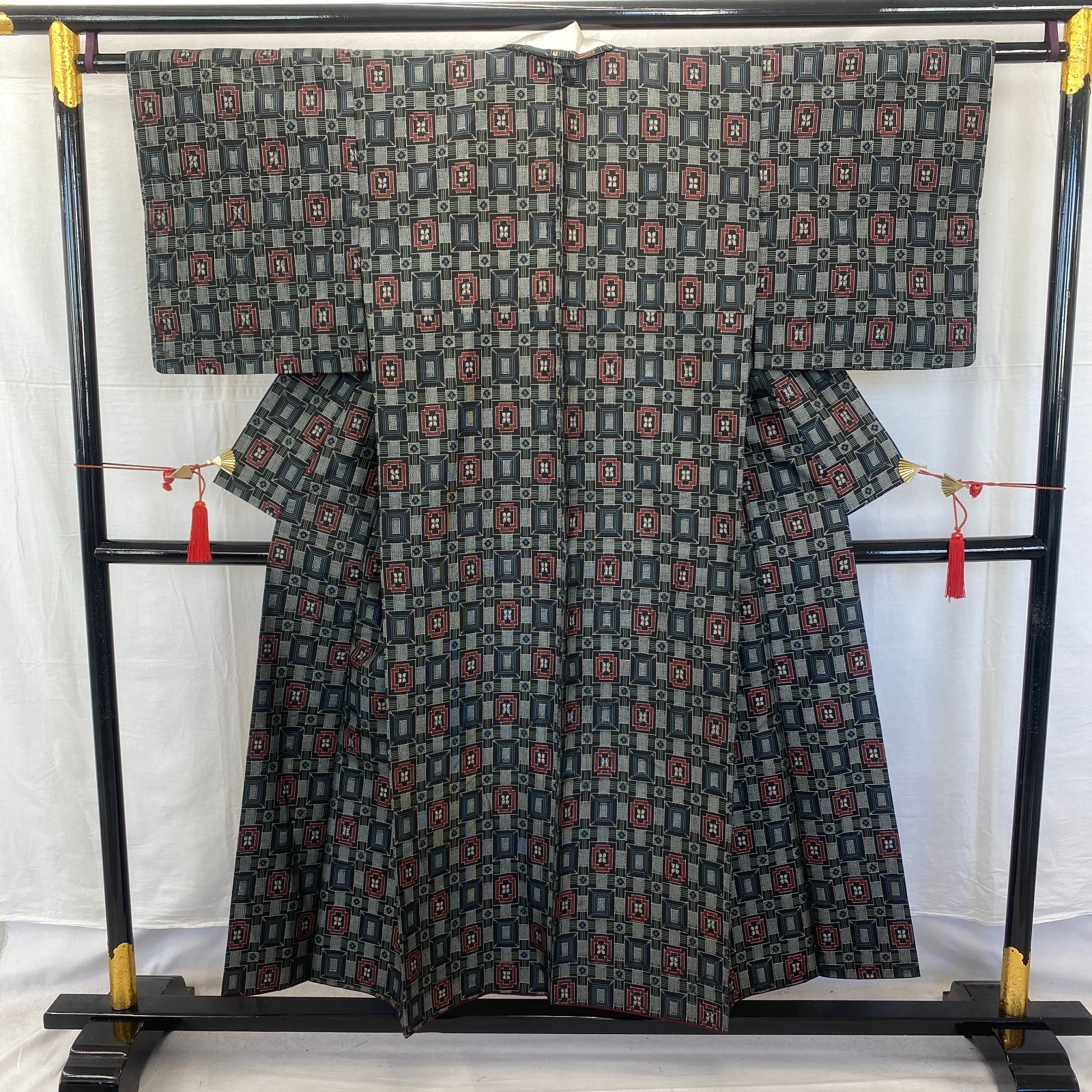 Japanese Vintage Kimono Silk Black Oshima Traditional Authentic Length 59 in