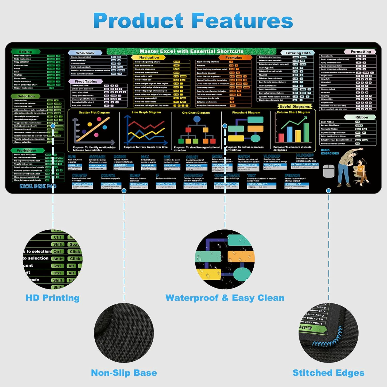 Excel Cheat Sheet Desk Pad 31.5X11.8In Excel Shortcut Keys Formulas Referenc