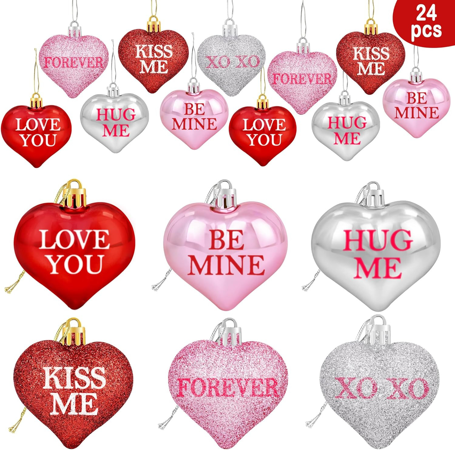 24Pcs Valentine'S Day Glitter Heart Shaped Ornaments- Valentines Decorations- Re