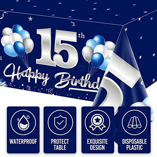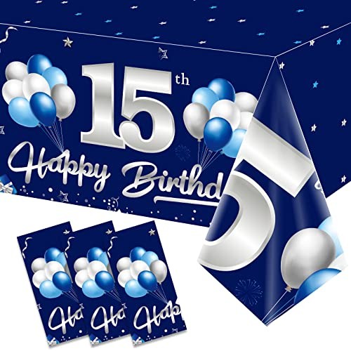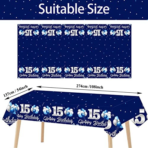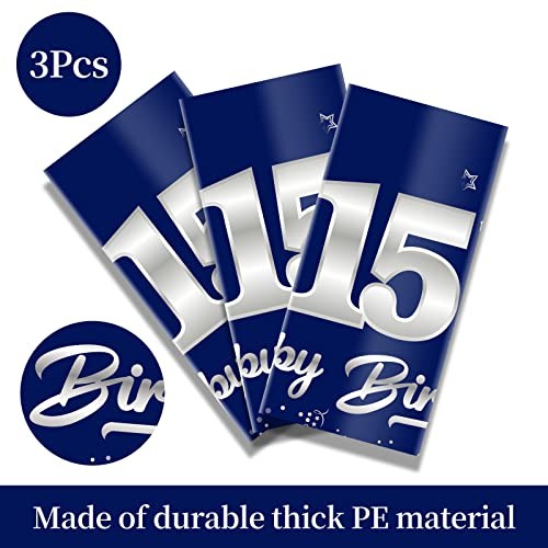 3 Pack Birthday Tablecloth Decoration for Boy, Navy Blue Happy Blue Silver 15th