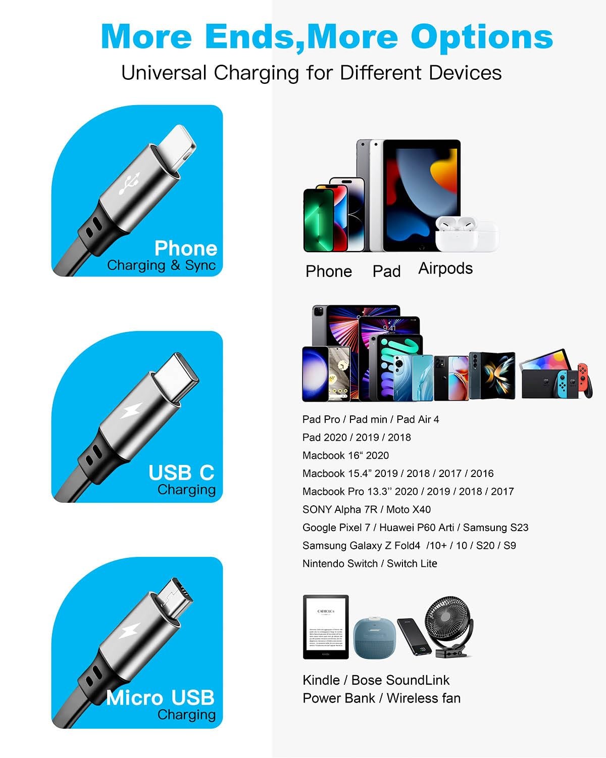 Multi Charging Cable 3A, 2Pack 4ft Retractable 4 feet, Black,Gray