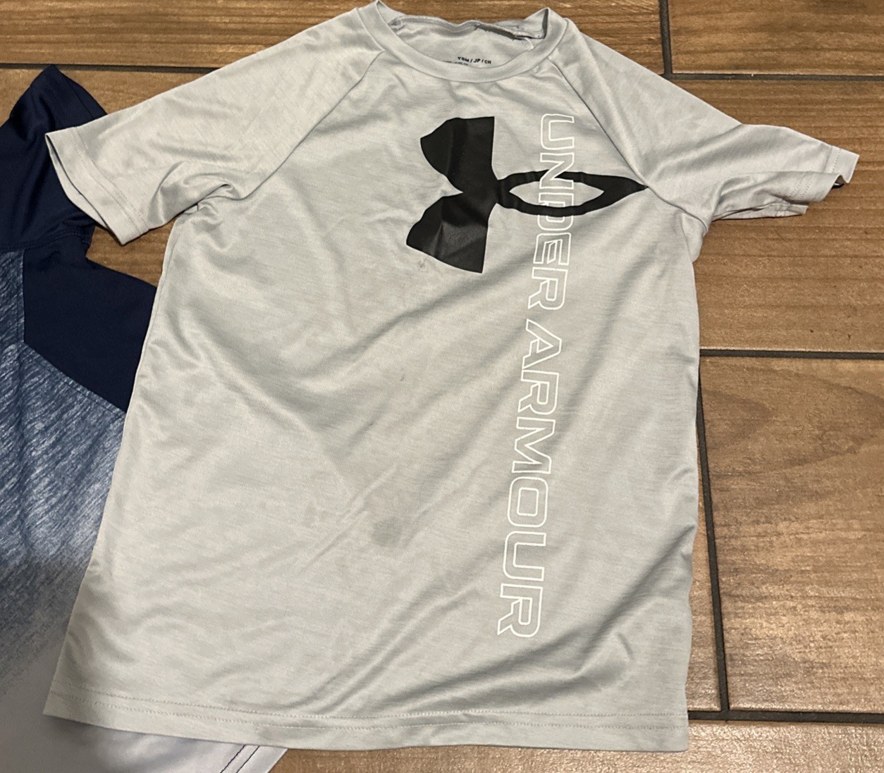 LOT OF 2 Under Armour Boys UA HeatGear Short Sleeve Shirt Gray Blue YSMALL A5