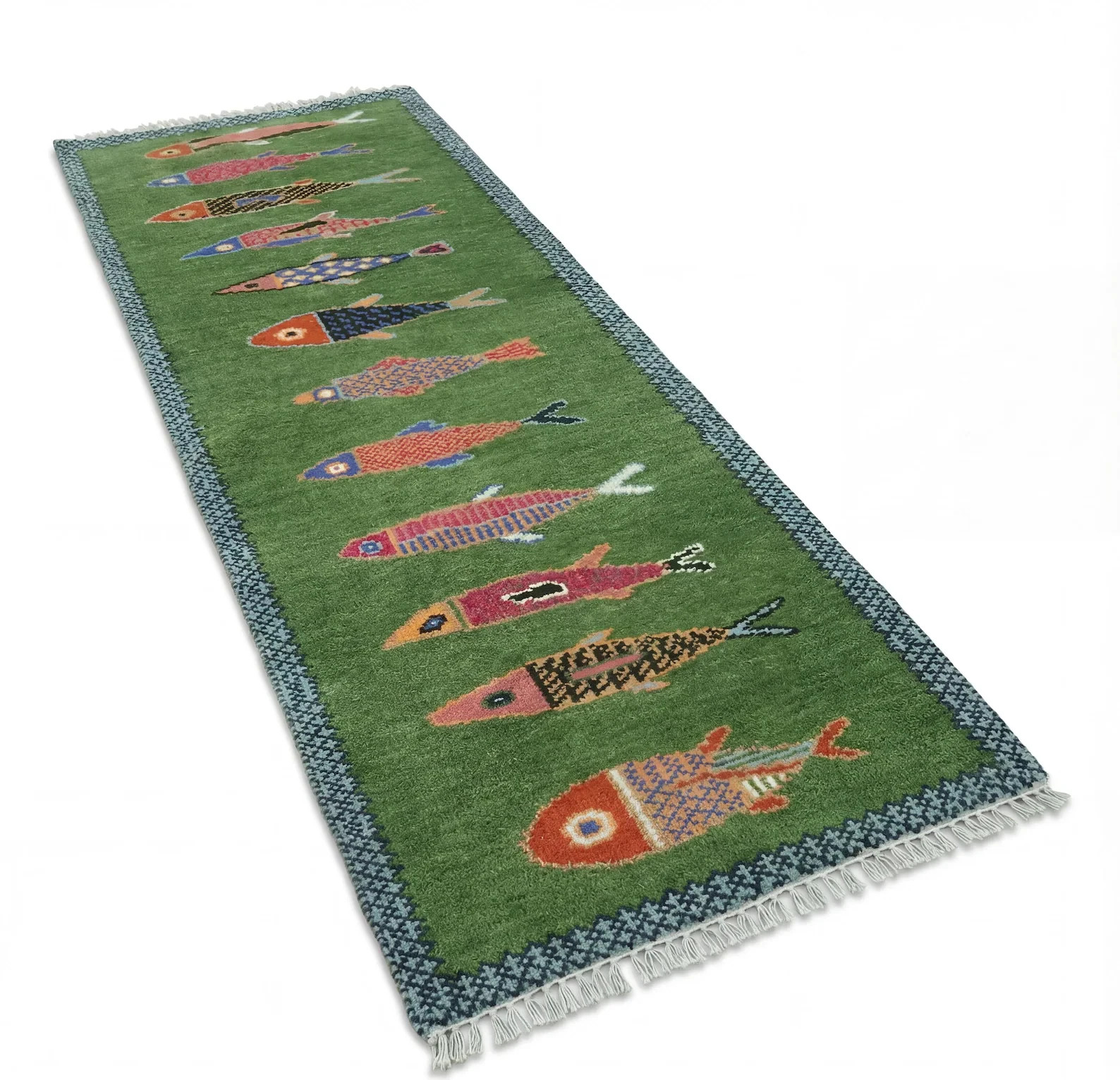 Handwoven Runner Wool Kilim Dhurrie Rug Color Green Multi Design Carpet Rug