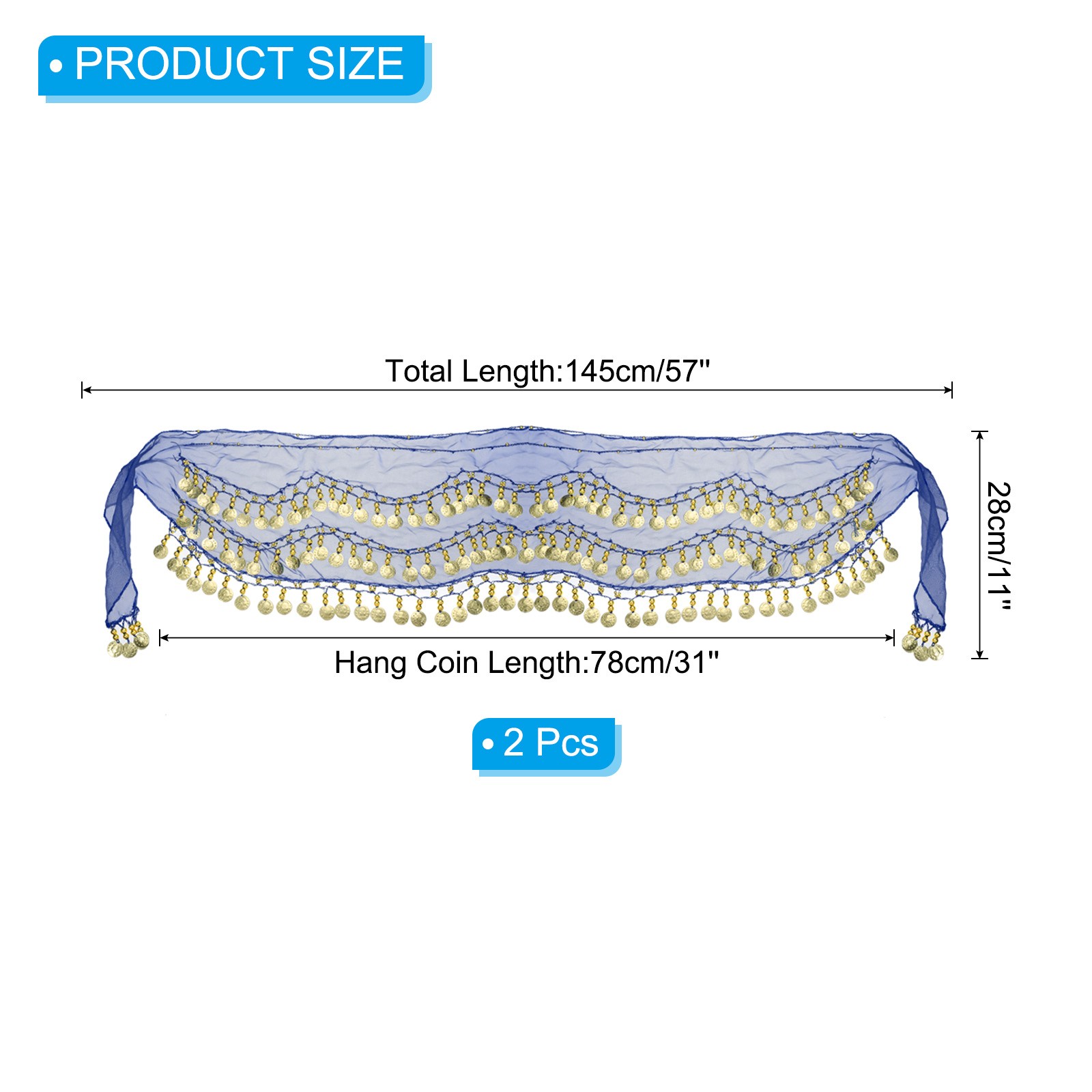 Belly Dance Hip Scarf 57 x 11 , 2 Pack Women Belly Dance Skirt, Sapphire Blue