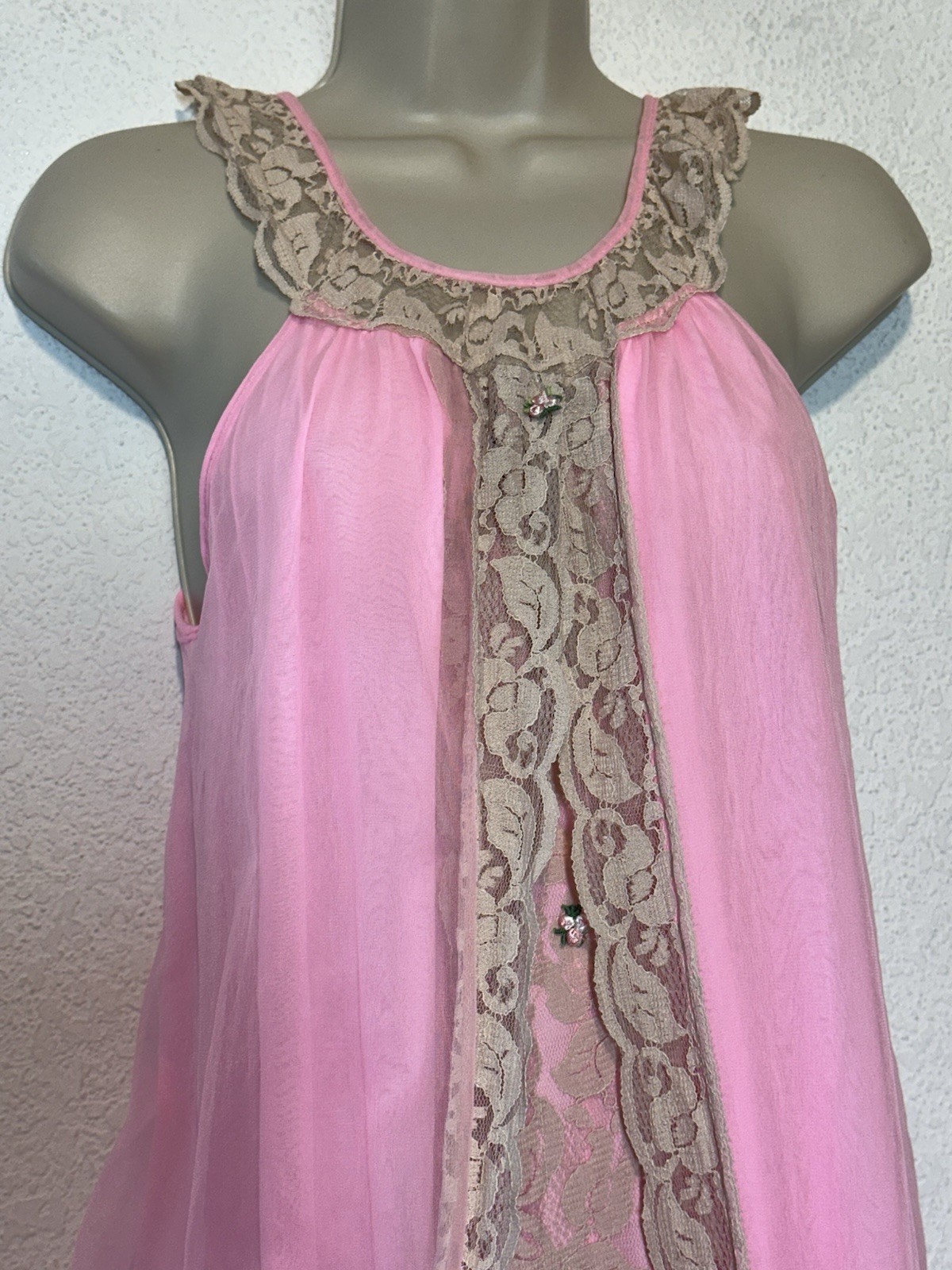 как выглядит Vintage 70s Hot Pink Sheer Chiffon Babydoll Nightgown W/Lace Size S/M фото