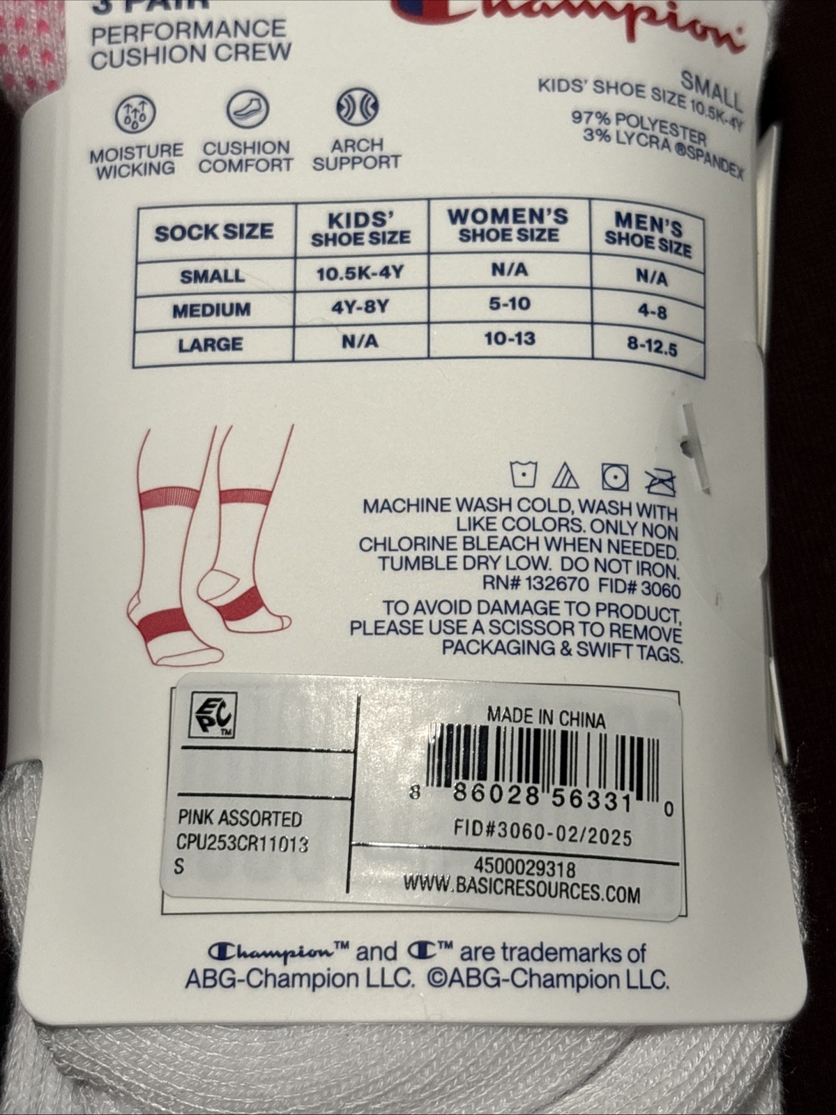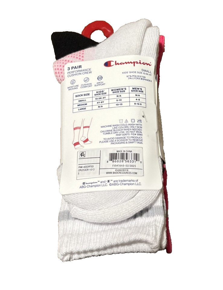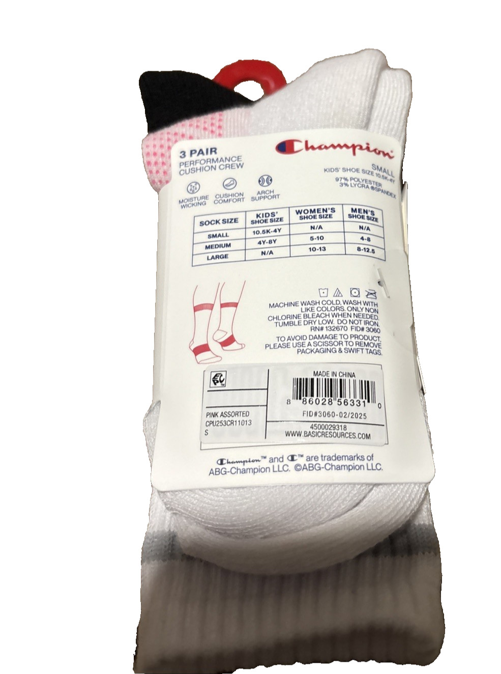 Champion Youth Crew All Sport Socks Girls Size 10.5k - 4Y moisture wicking