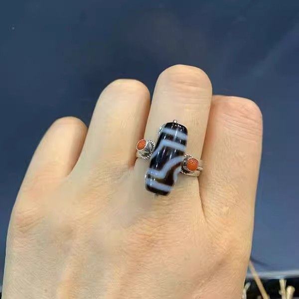 Nepal Inlay Dzi Bead Ring Silver Plated Ethnic Adjustable Open Band Unisex