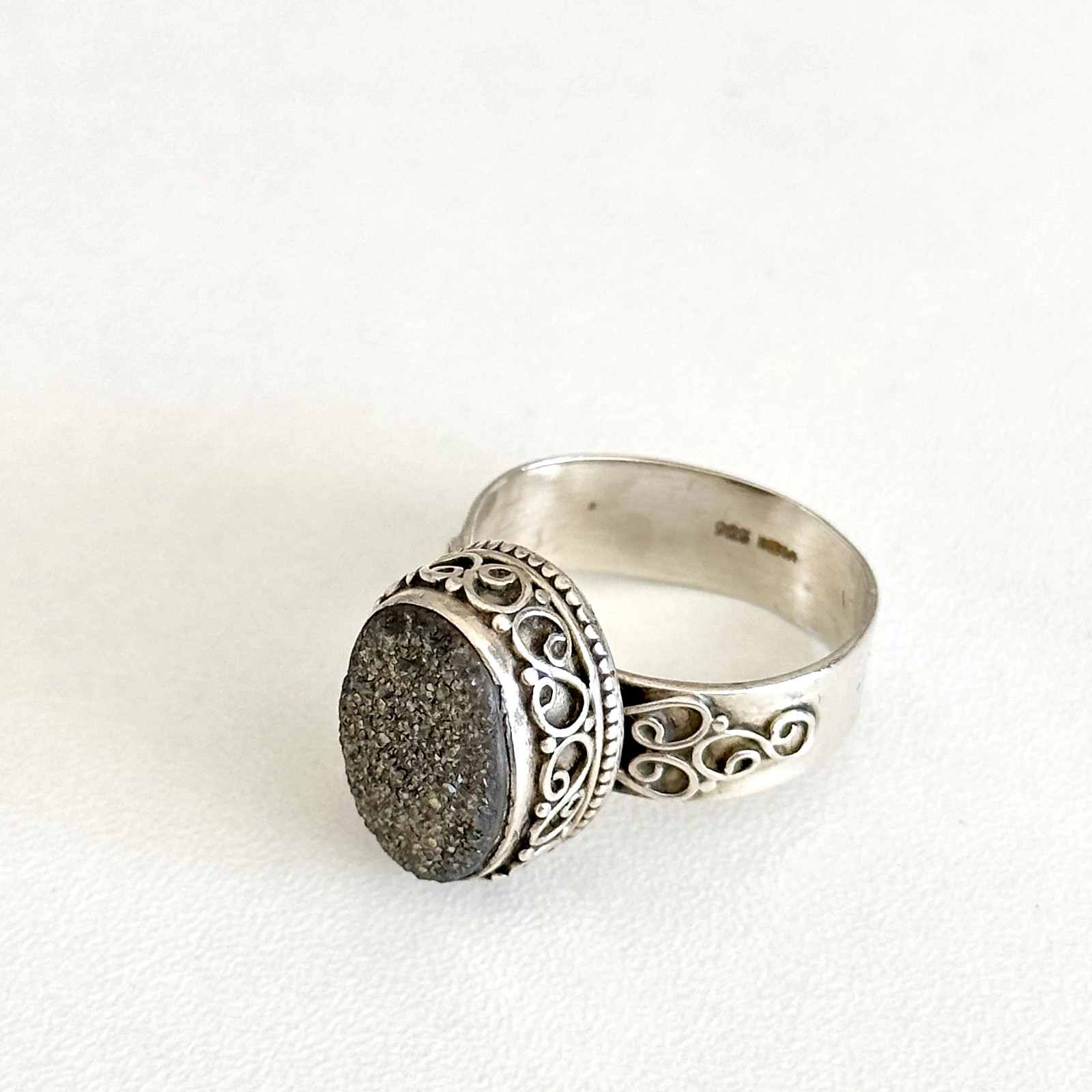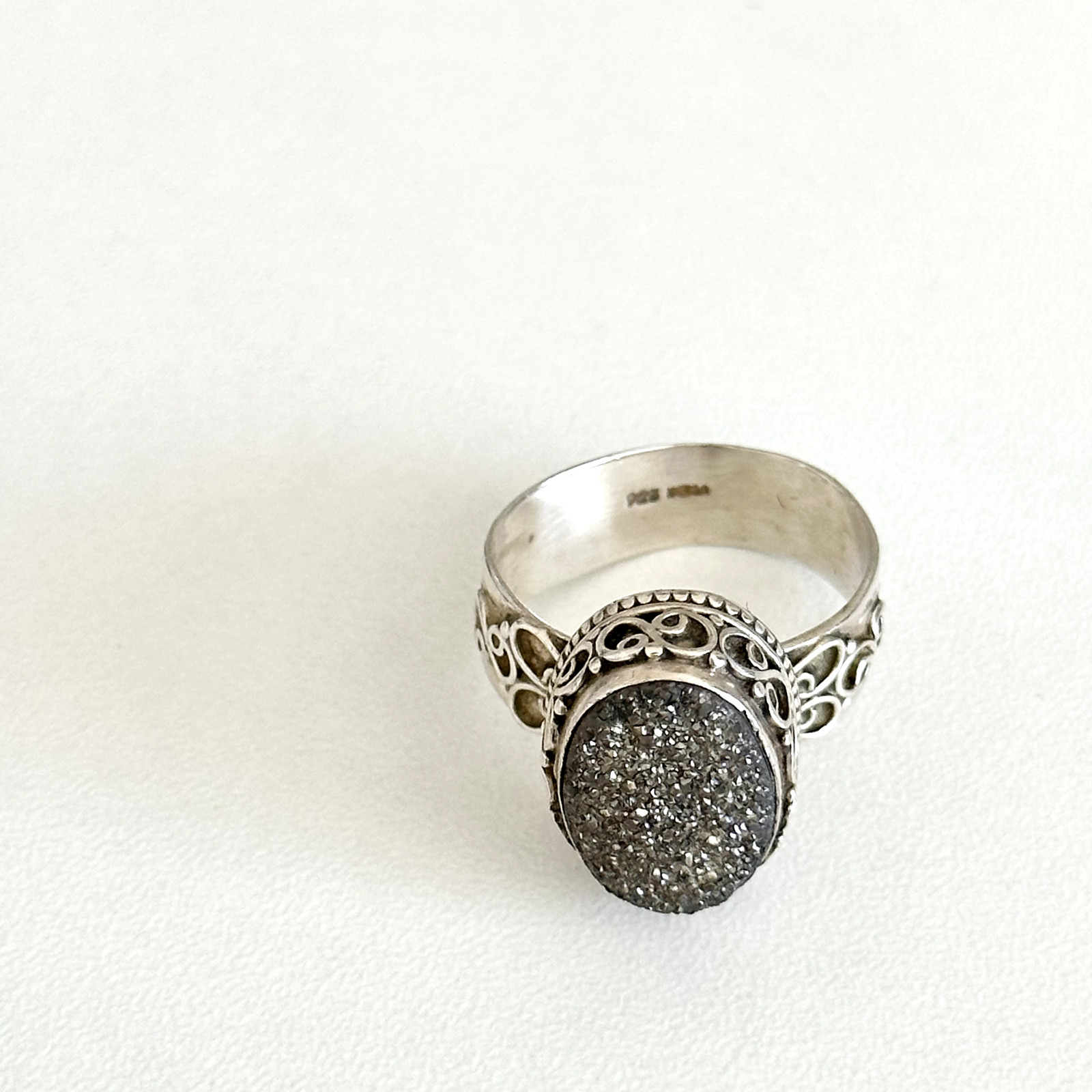 Vintage 925 Sterling Silver India Druzy Quartz Filigree Scroll Ring Size 6.75