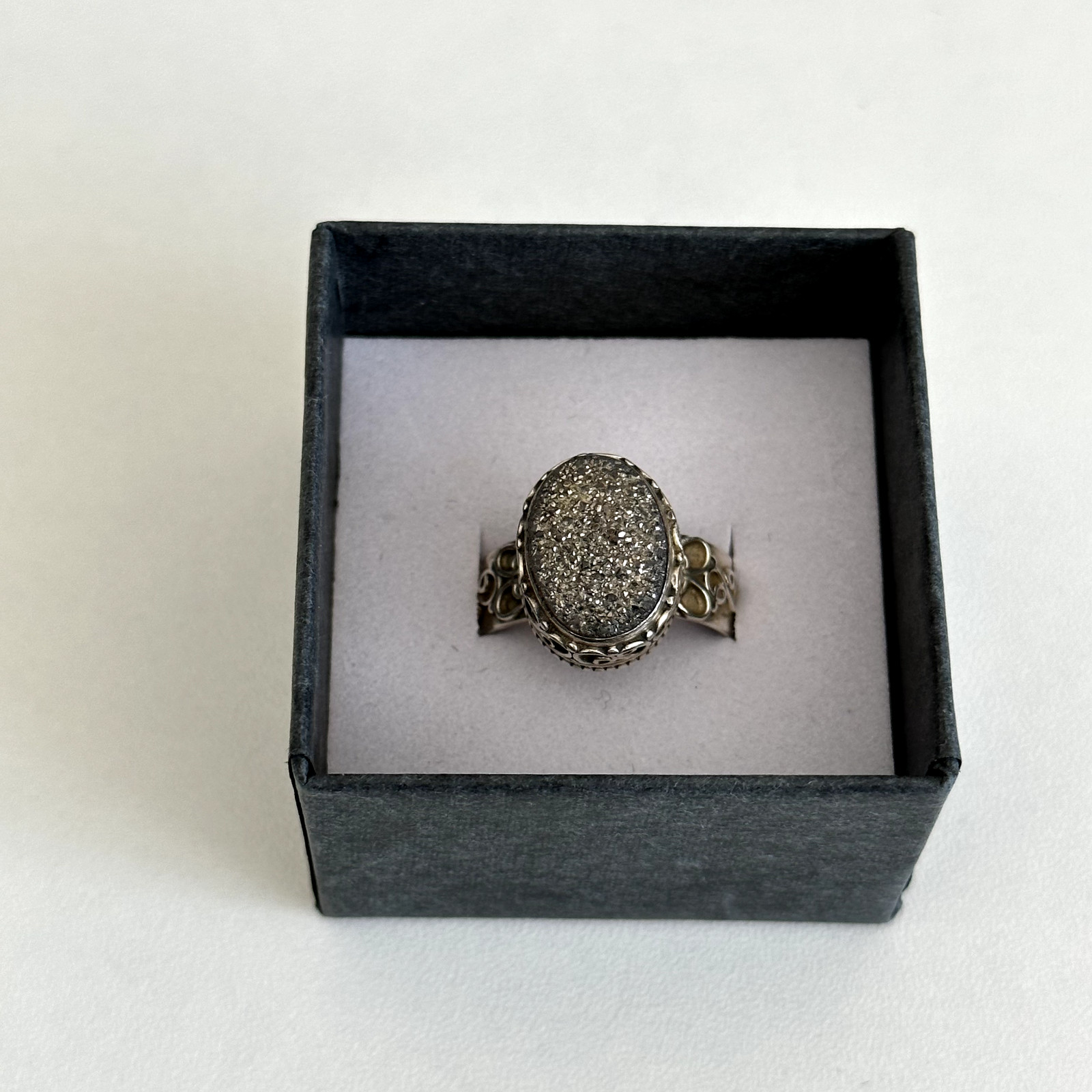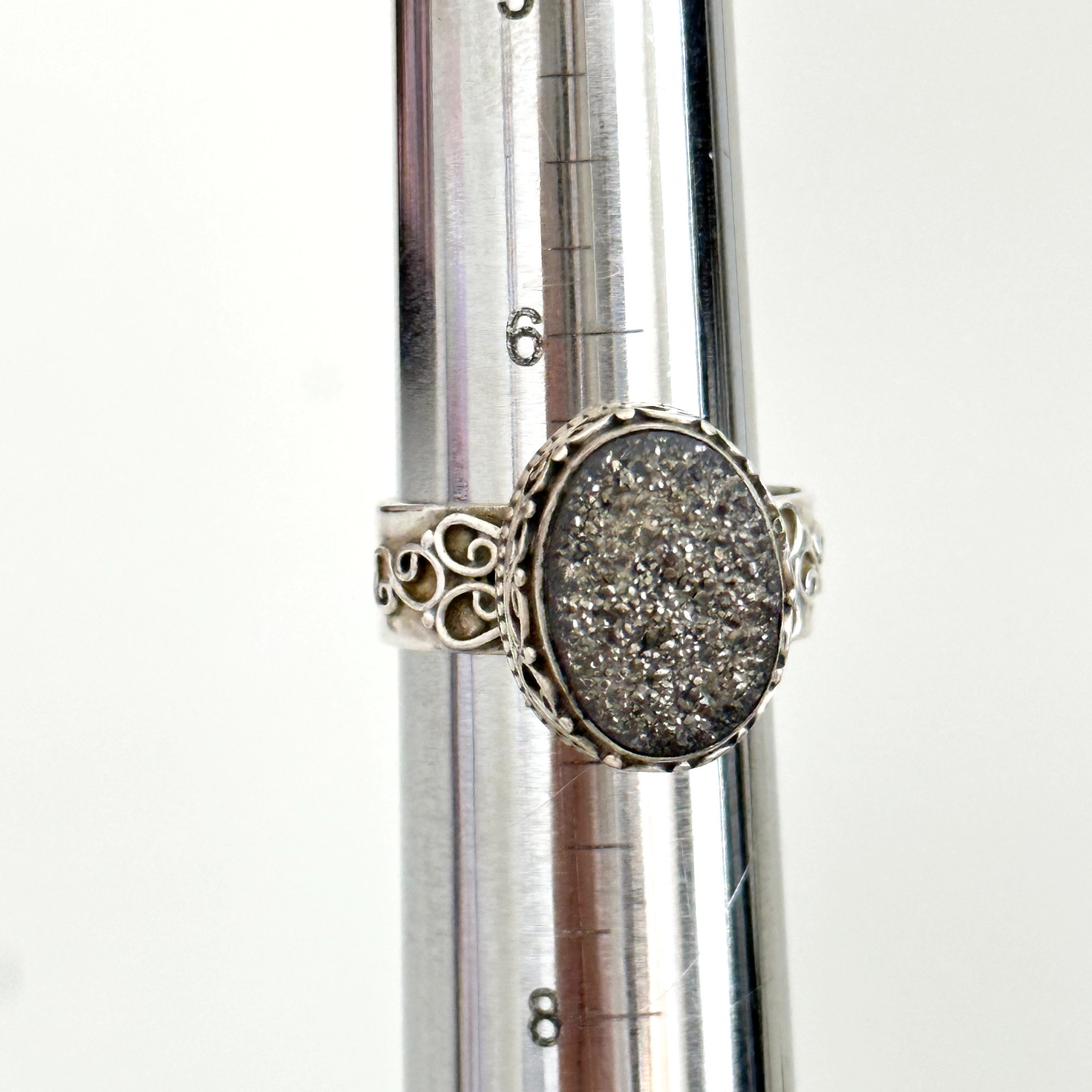 как выглядит Vintage 925 Sterling Silver India Druzy Quartz Filigree Scroll Ring Size 6.75 фото