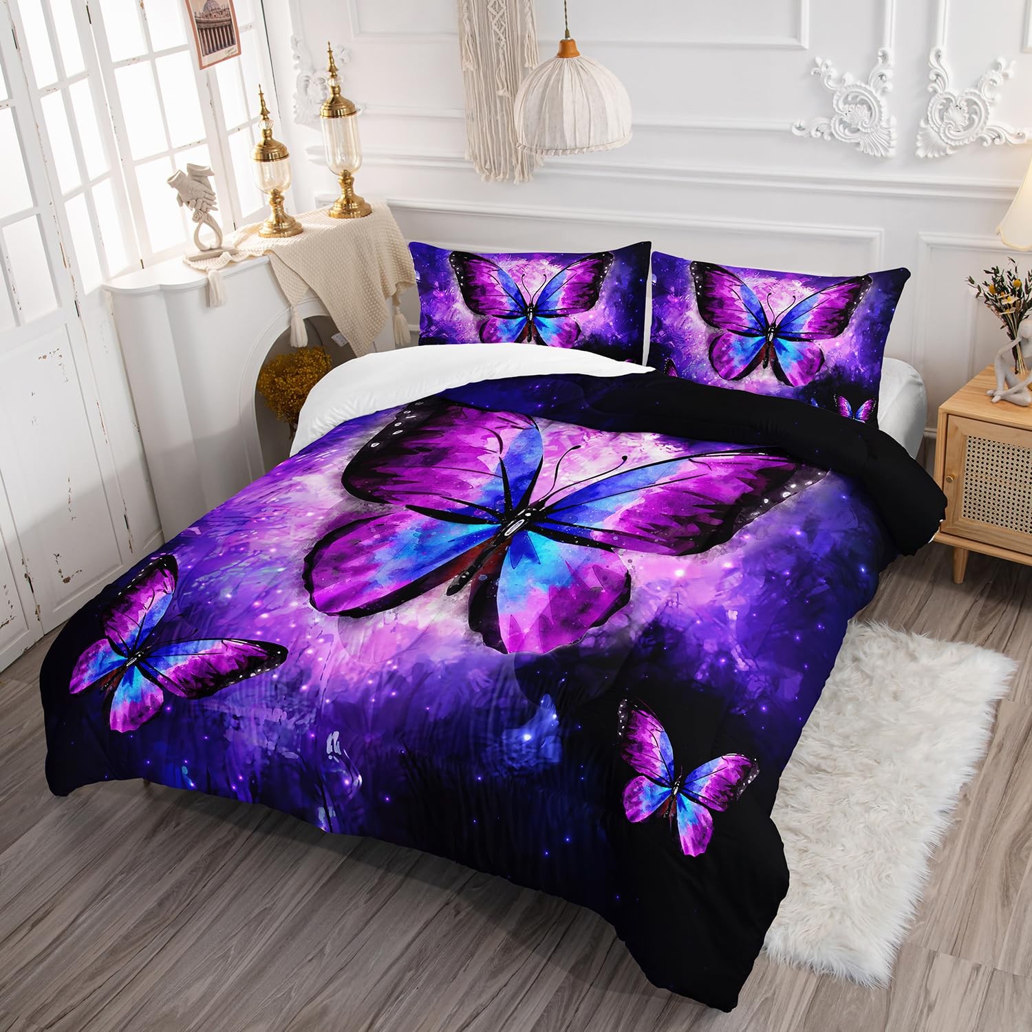 Beautiful Butterfly Comforter Set Queen Size, Glowing Purple Butterfly Beddin...