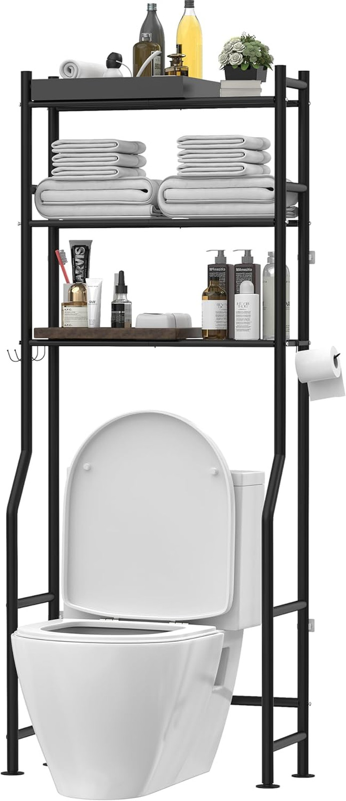 3-Tier over the Toilet Storage, Freestanding Metal Bathroom Shelves with 4 Hooks