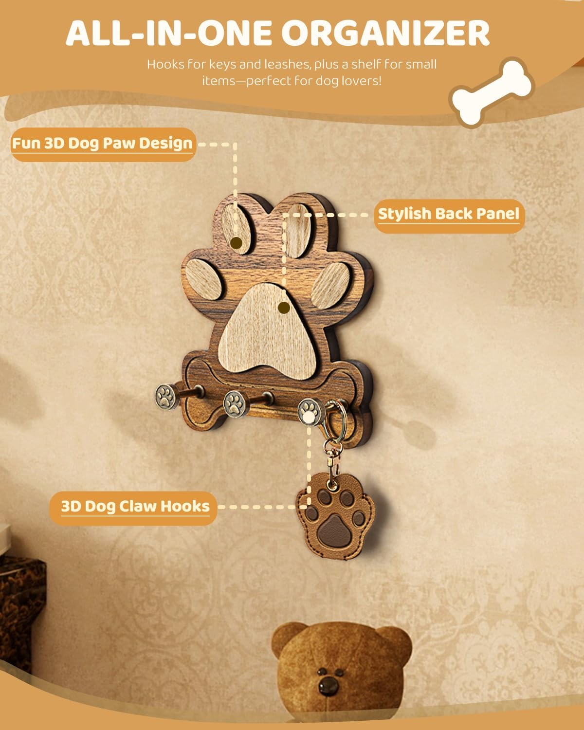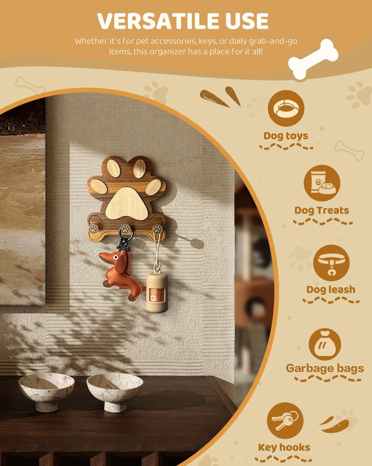 MTERSE Wooden Dog Leash Holder for Wall Dog Leash Holder, Key Rack, and Coa...