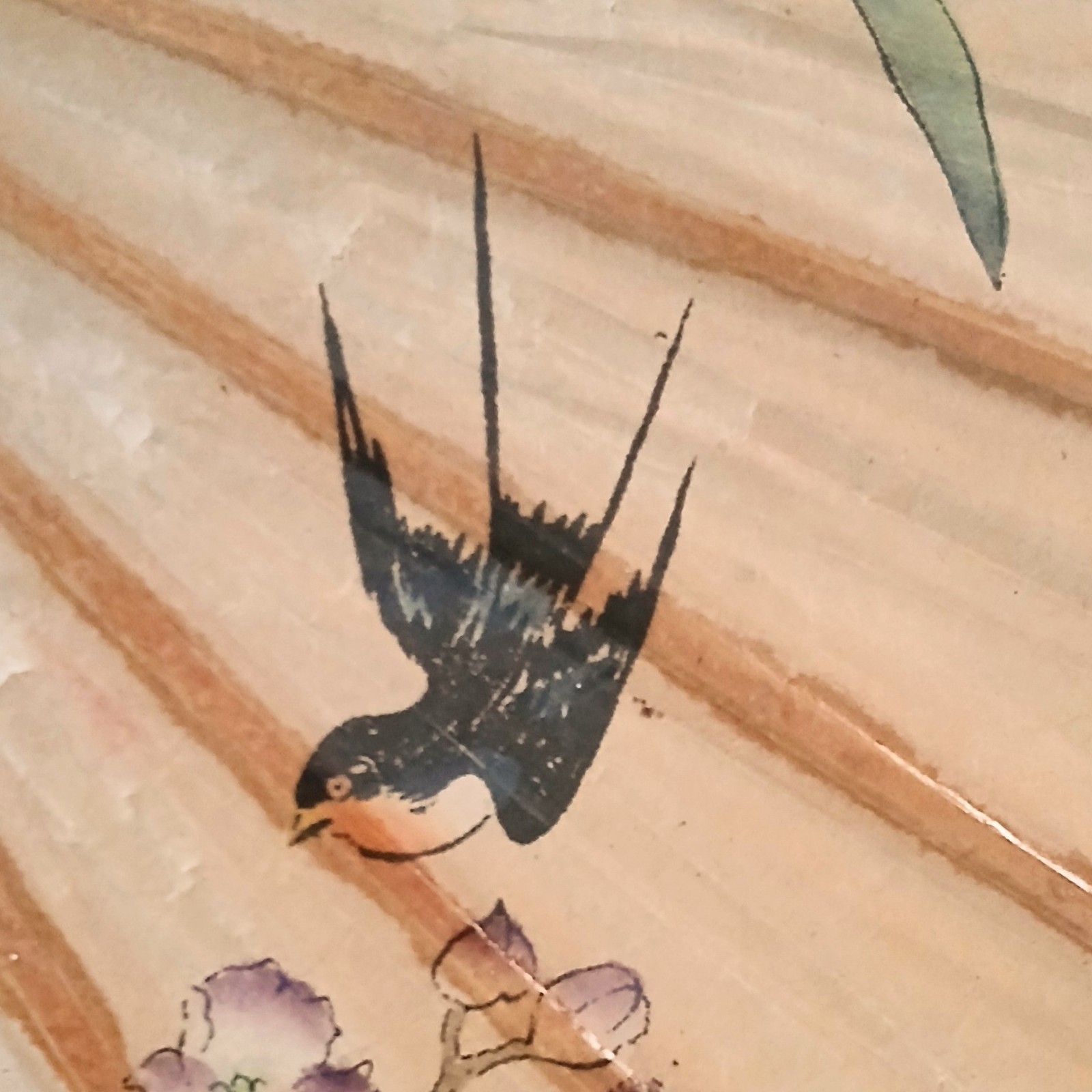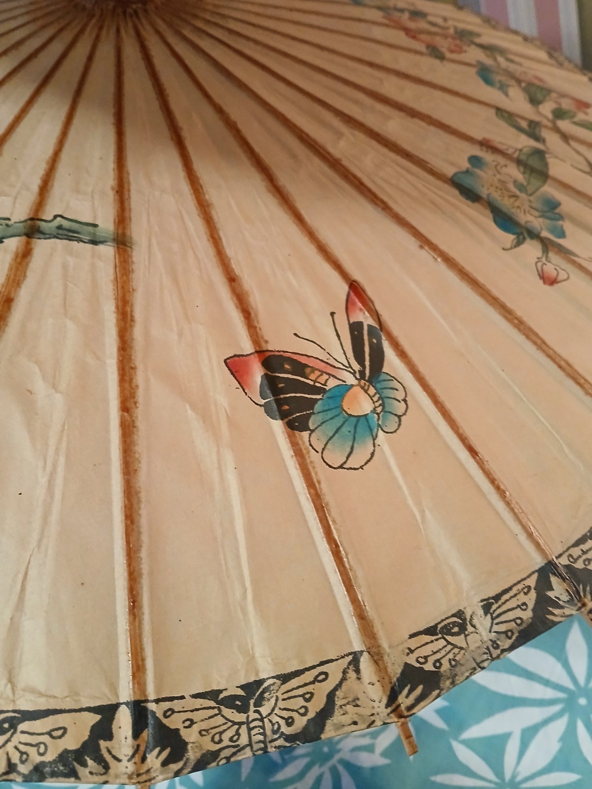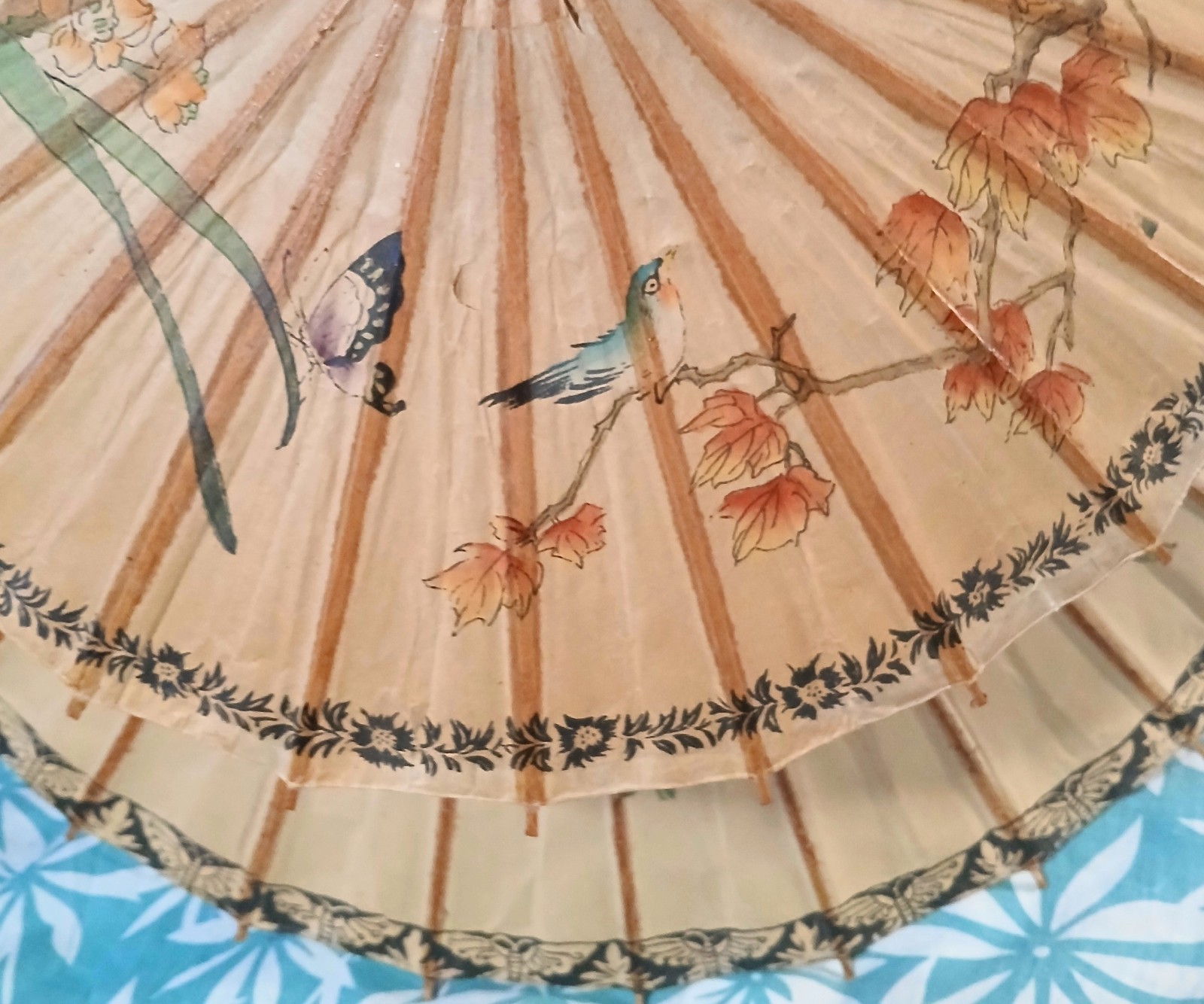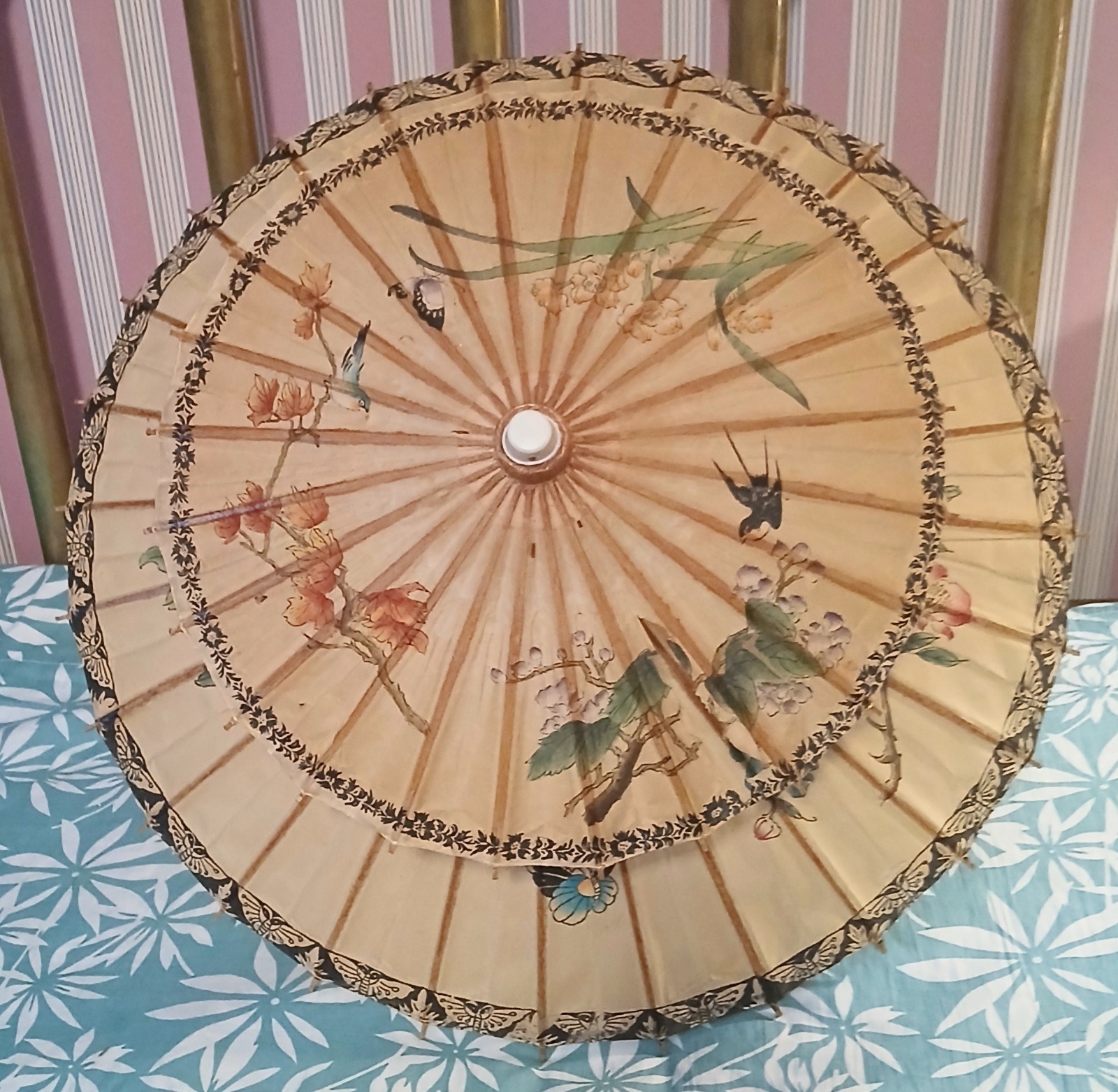 Double Parasol / Double Umbrella w/ Colorful Birds Flowers, Rice Paper, Bamboo