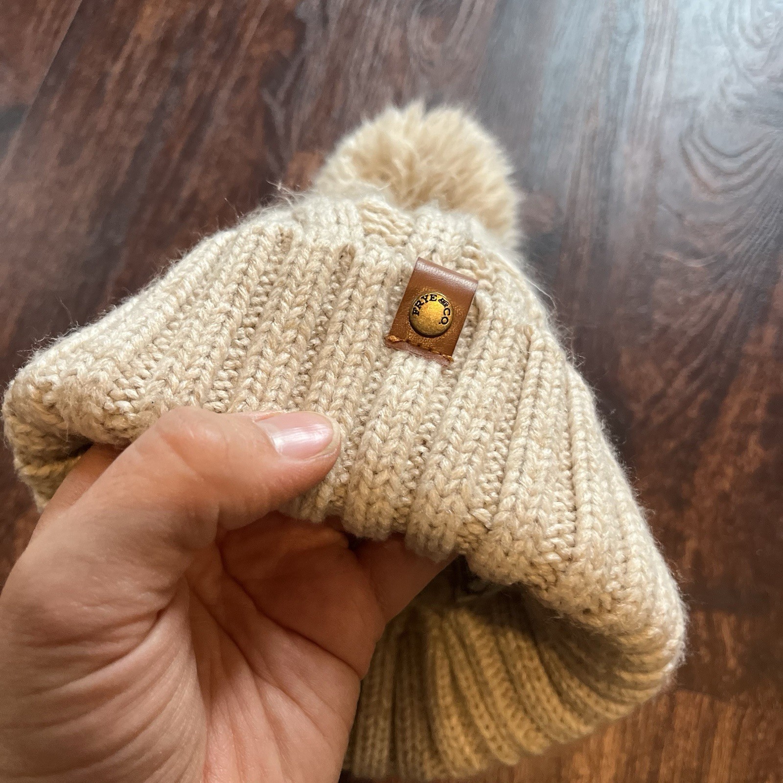 Frye and Co Beanie Womens Beige Steel Cut Oats Cable Knit Pom Cuff Hat Toque