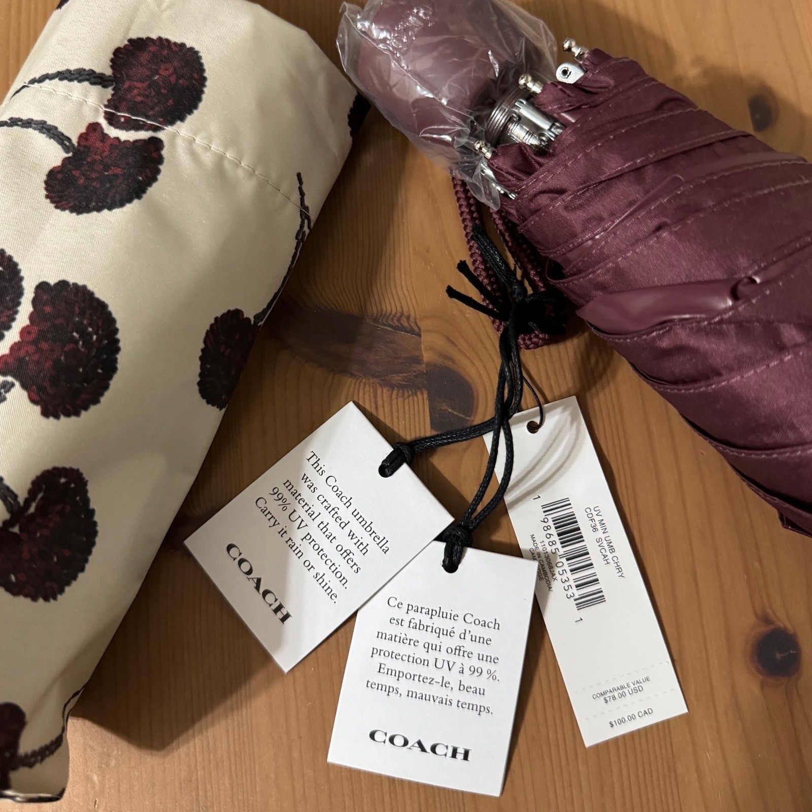 как выглядит NWT  Coach Uv Protection Mini Umbrella With Cherry Print фото