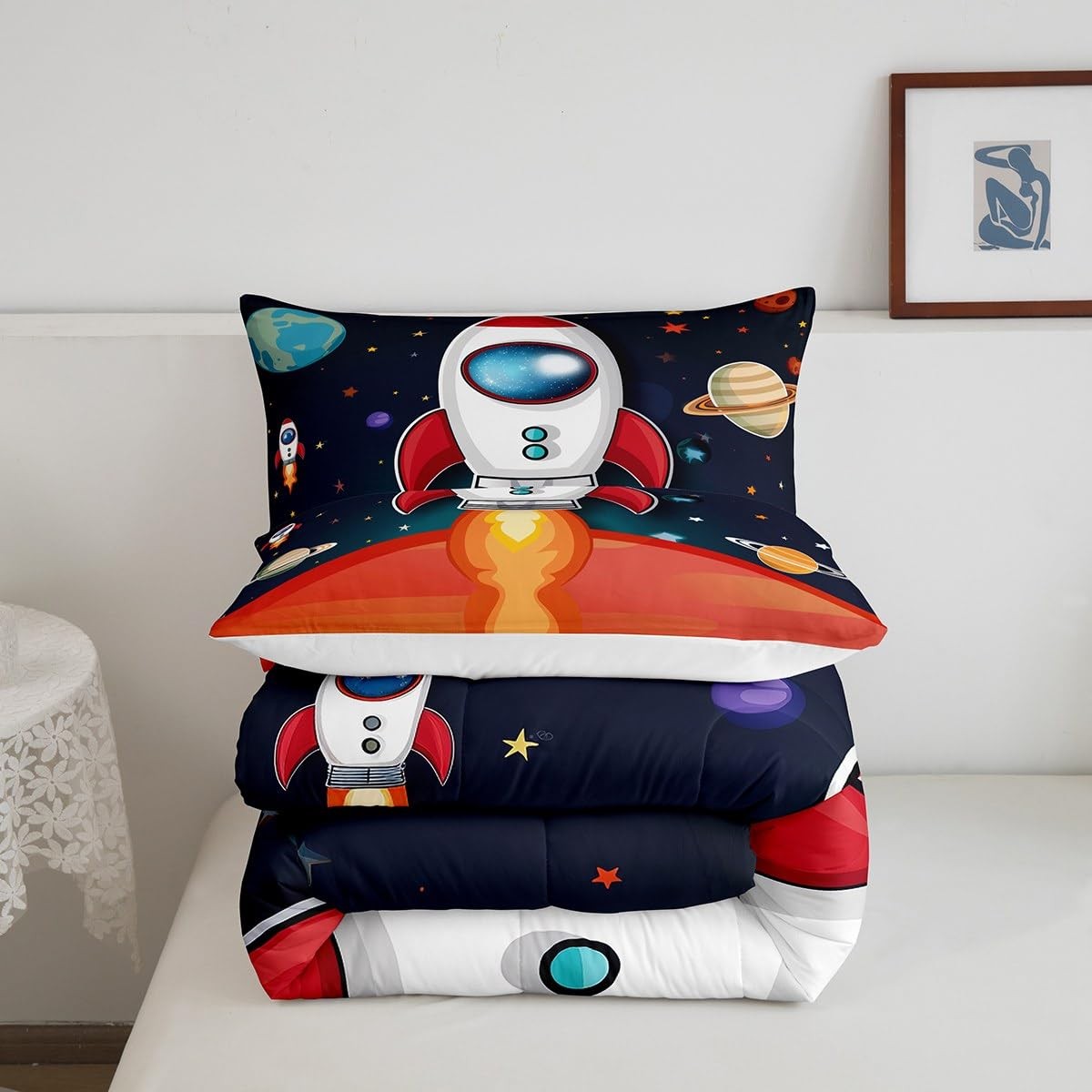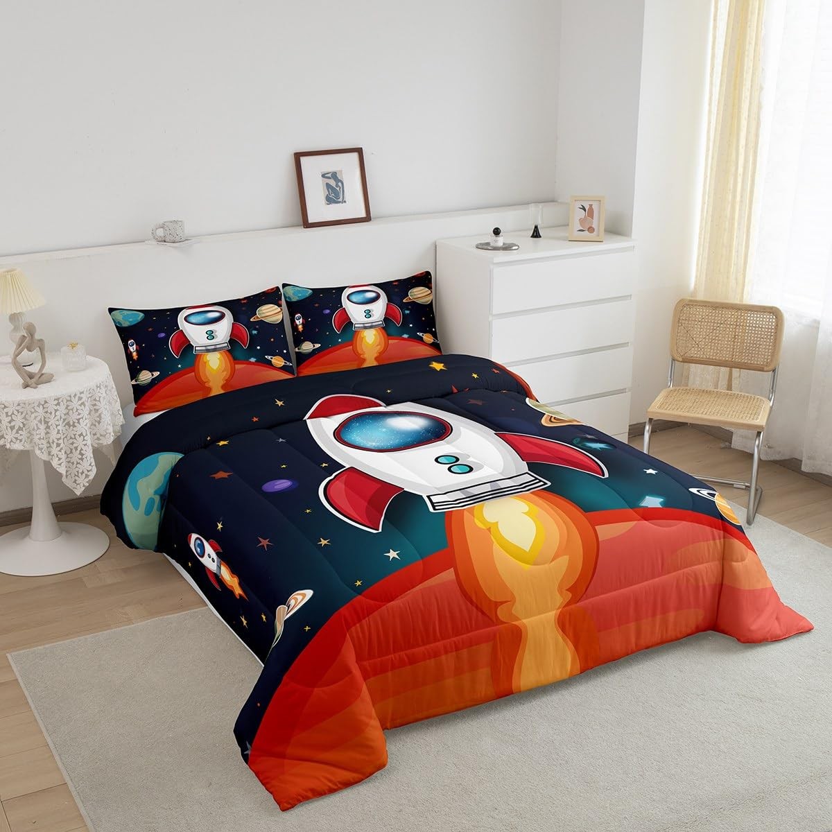 Space Comforter Set Boys 3 Piece Space Ship Rocket Print Full Size Bedding Se...