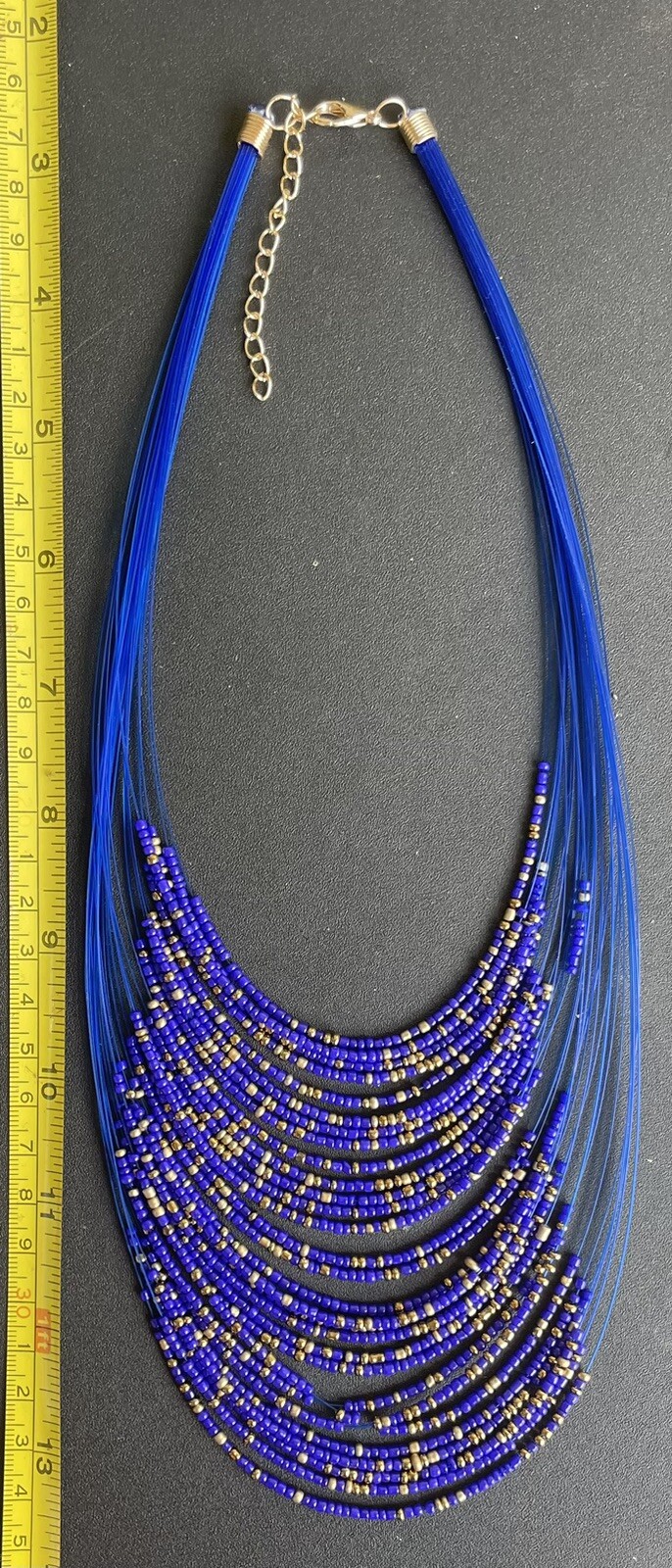 как выглядит Blue Gold Seed Bead Layered Matinee Necklace Drop Seed Bead Earrings Set Boho фото