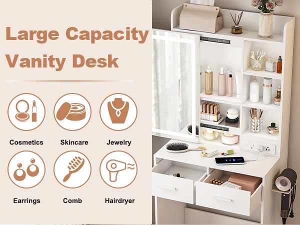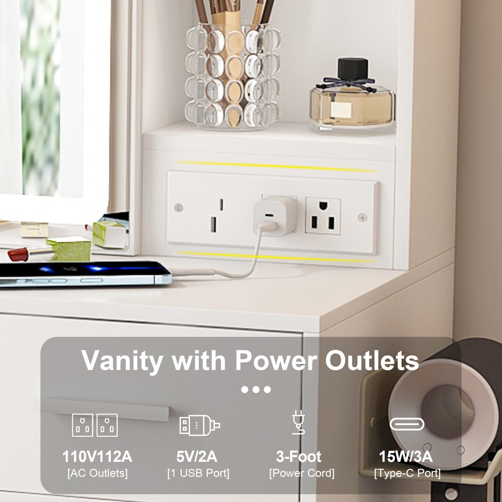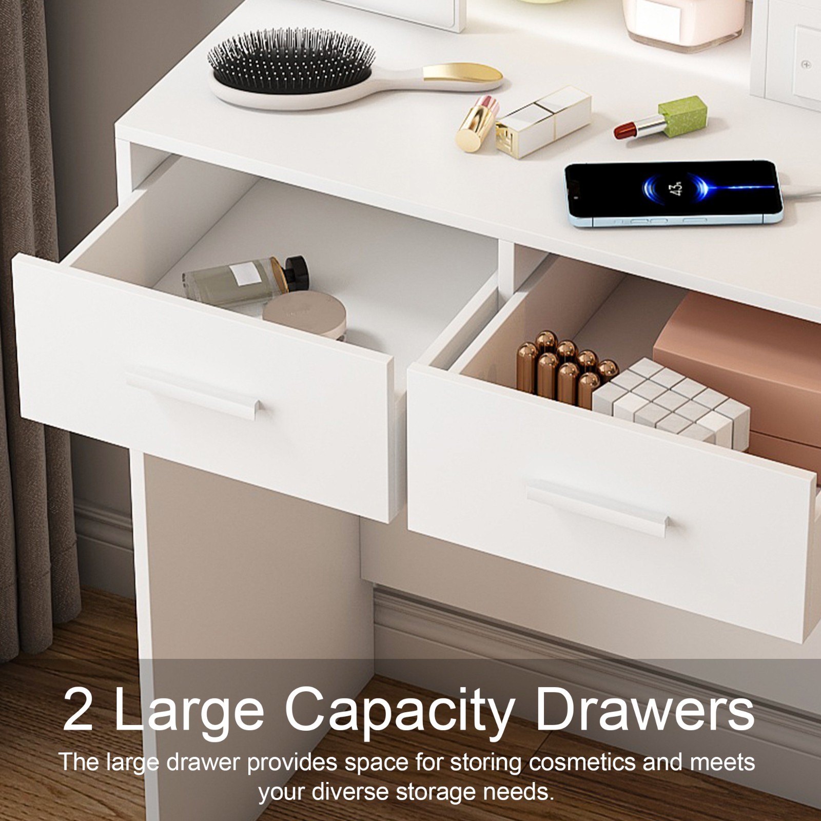 как выглядит Small Makeup Vanity Desk with Mirror and Lights,Charging Station,2 Large Drawers фото