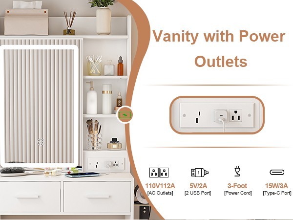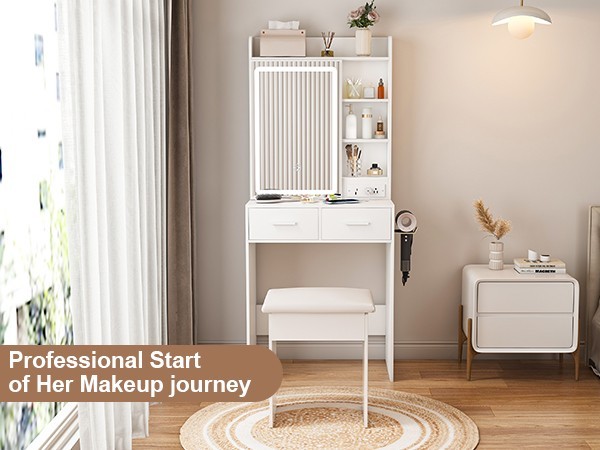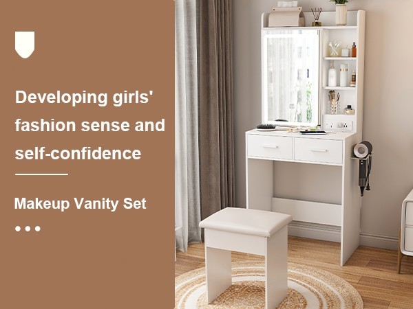 Small Makeup Vanity Desk with Mirror and Lights,Charging Station,2 Large Drawers
