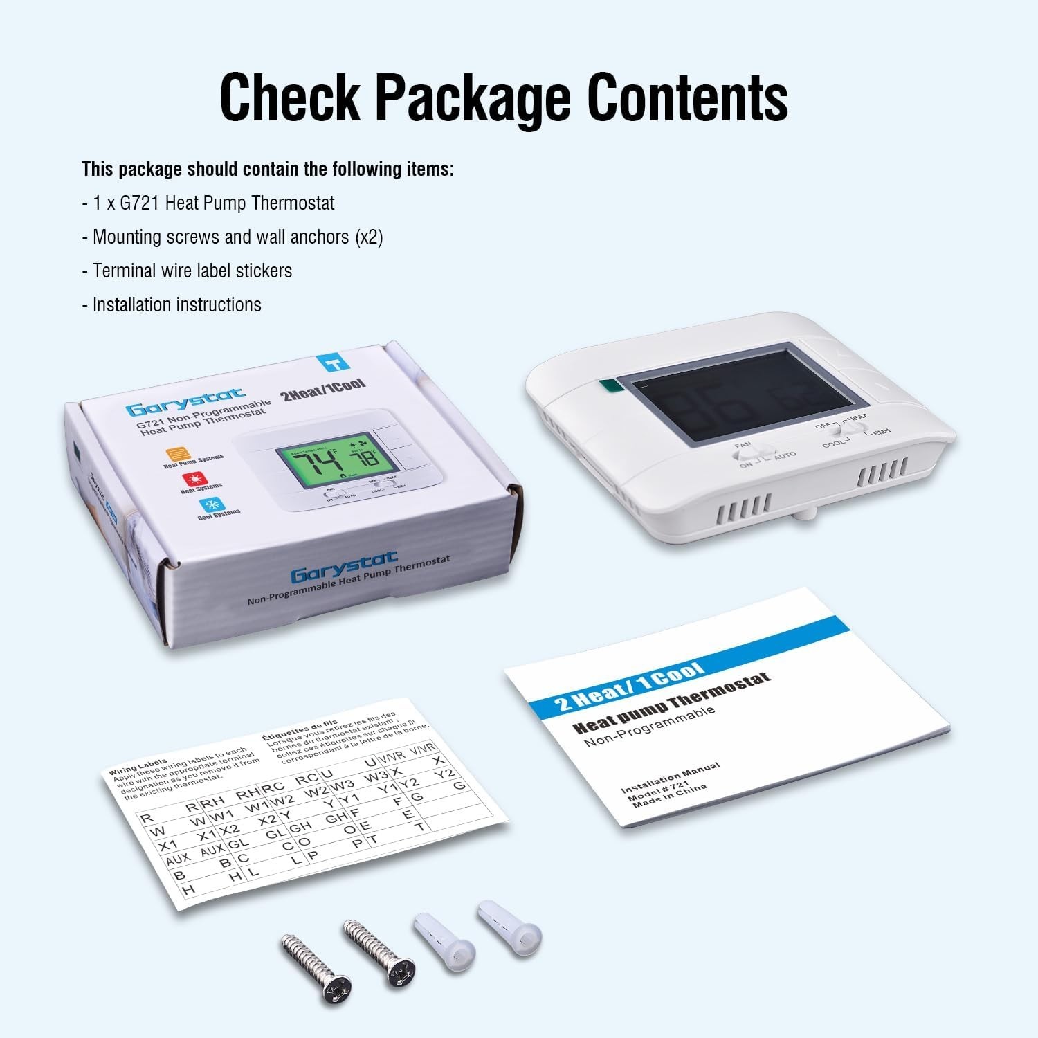 Garystat Non-Programmable Heat Pump Thermostat 2H/1C LCD Display