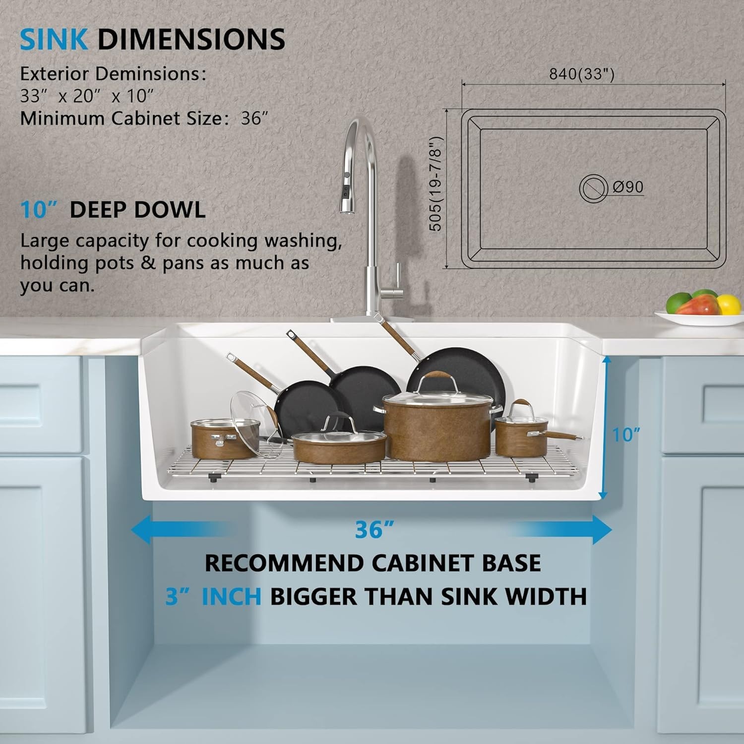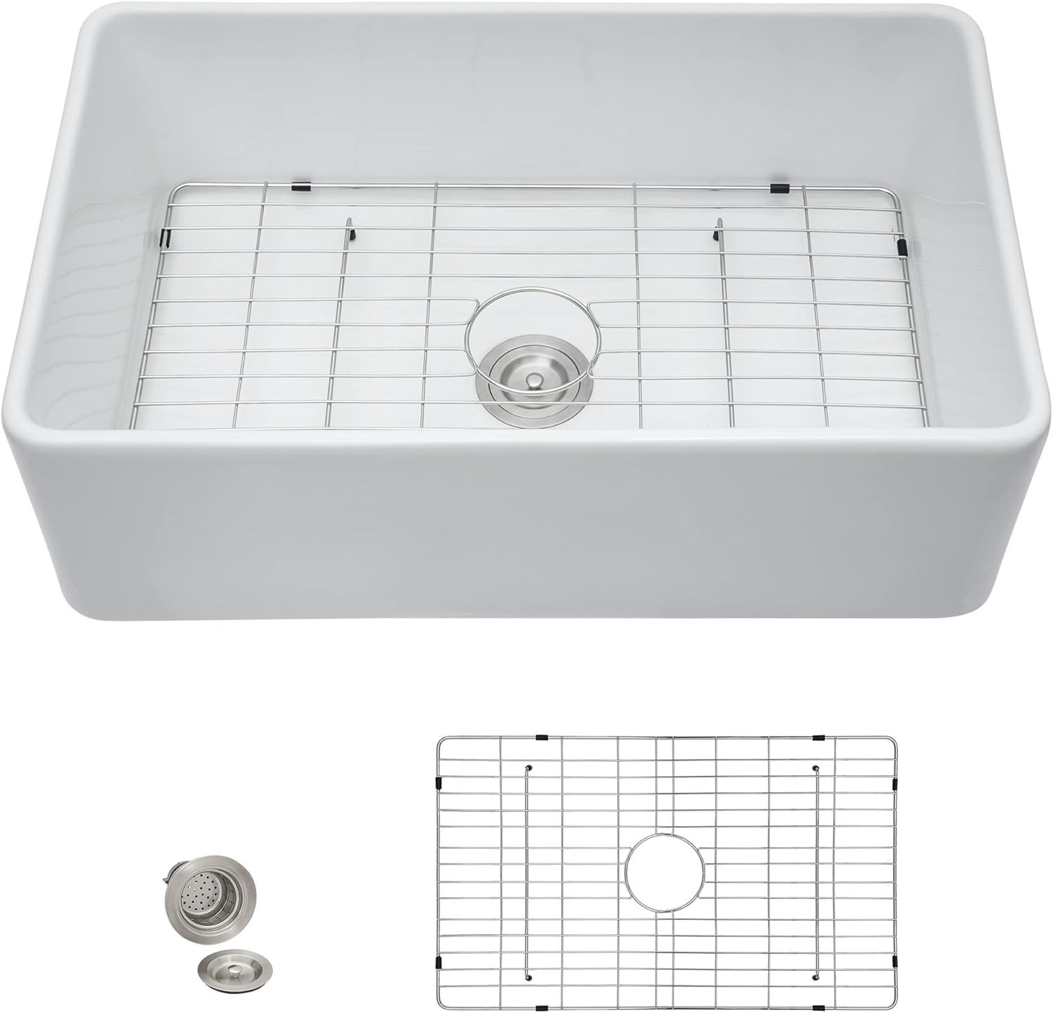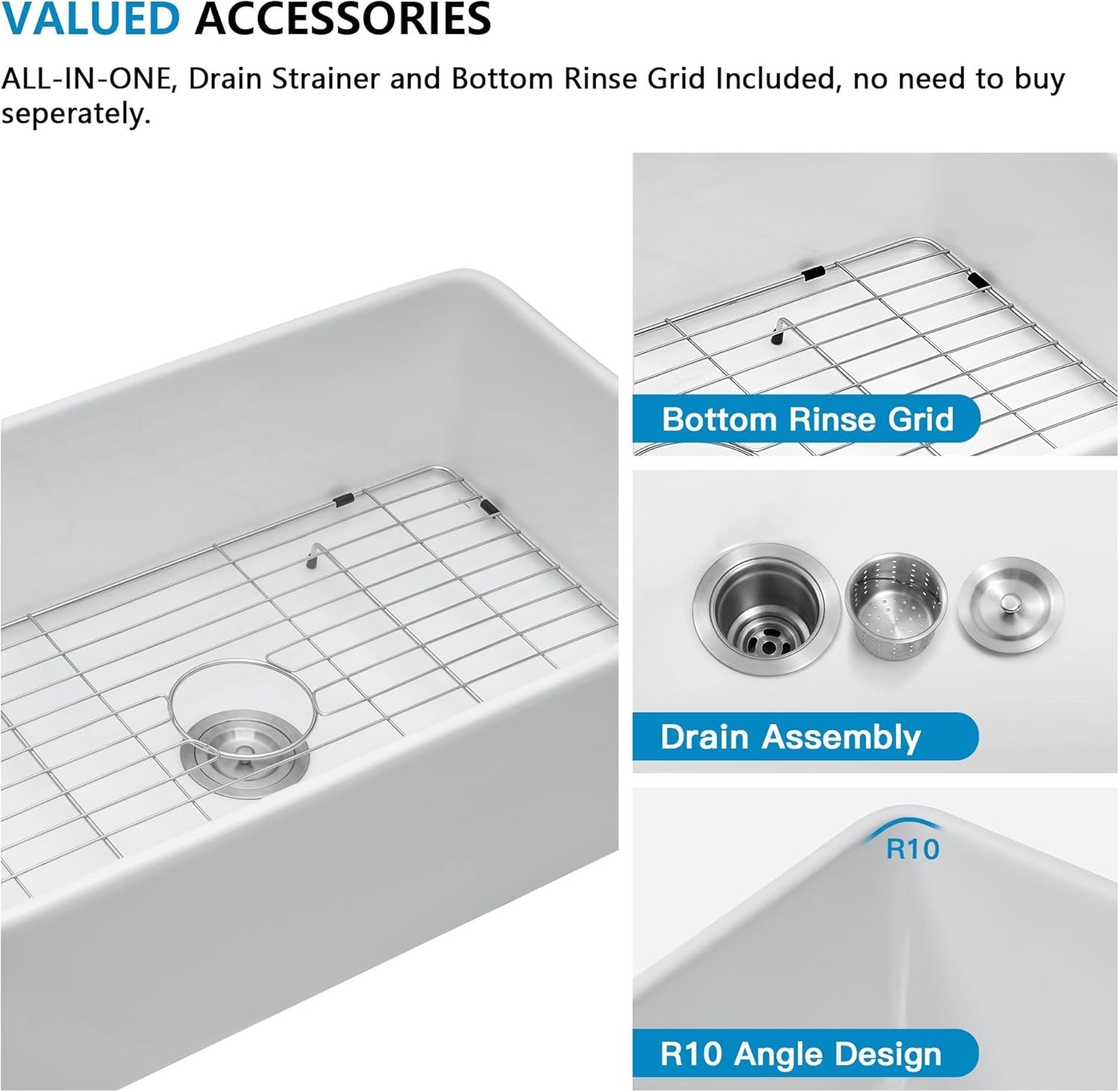 Included Components: 33 inch single bowl white farm kitchen sink, bottom rinse grid, d