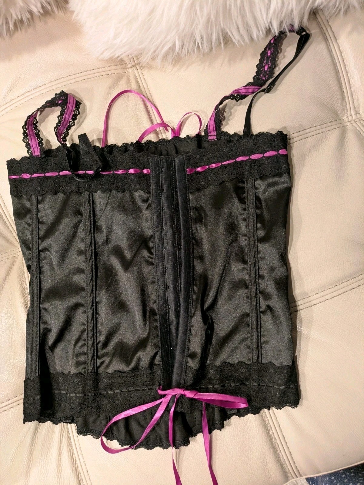 Frederick's of Hollywood Corset Bustier Lingerie Pink Black Lace Boned sz 38 New