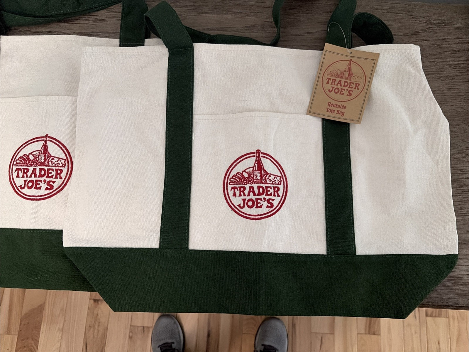 как выглядит 2 TRADER JOES LARGE CANVAS BAG HEAVY COTTON REUSABLE TOTE BAG LARGE GREEN фото