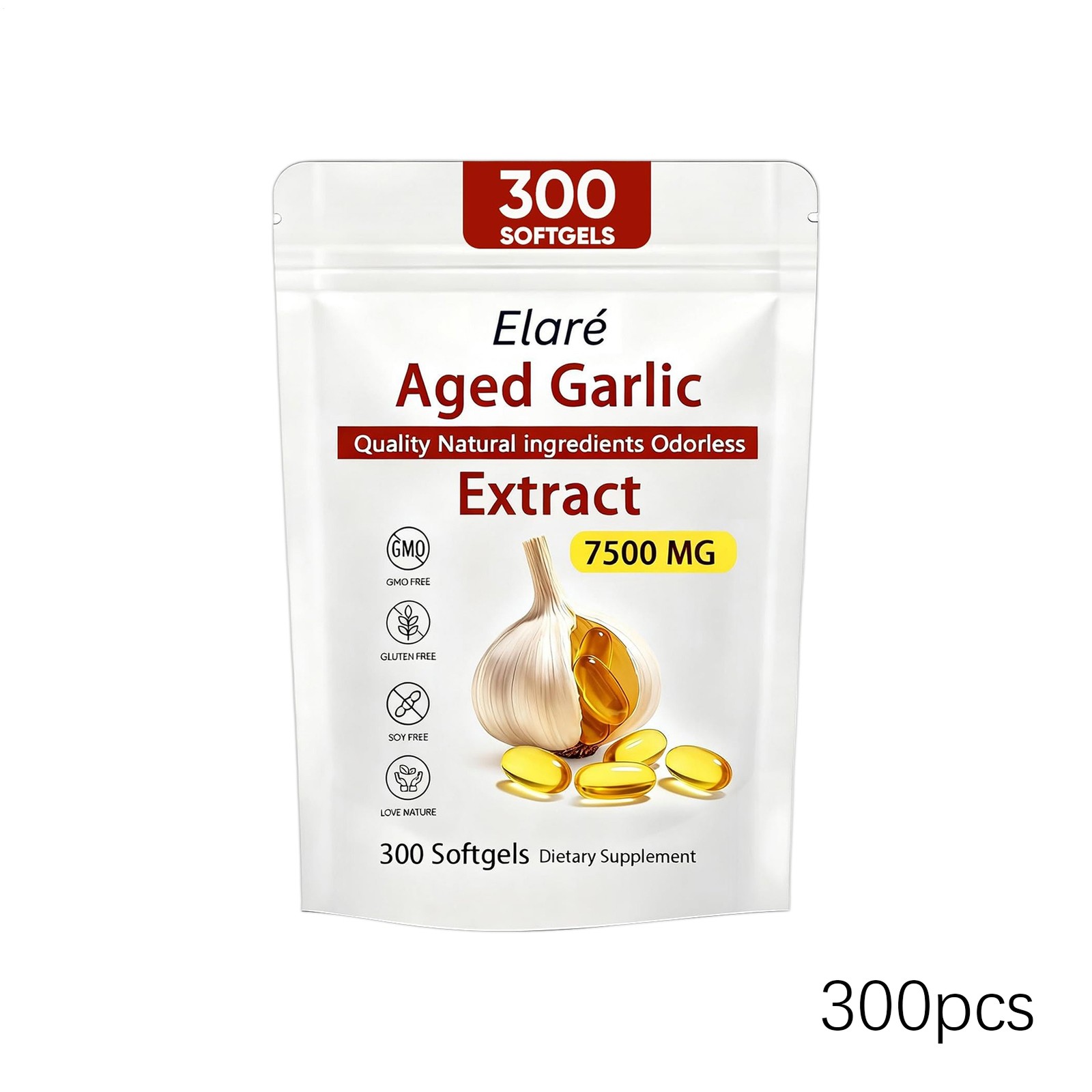 1 PACK Elare Aged Garlic Extract, 300 Softgels, 7500mg Odorless Heart Immune
