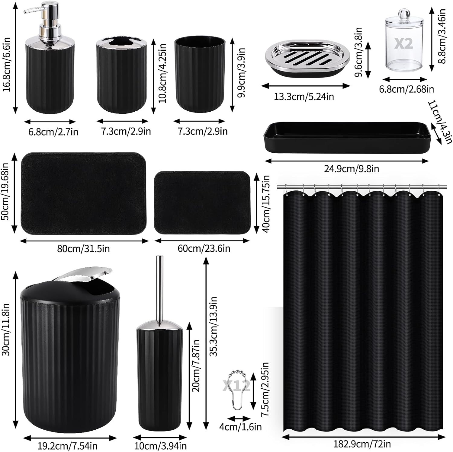 24 PCS Black Bathroom Accessories Set with Shower Curtain and Rugs, Bathroom ...