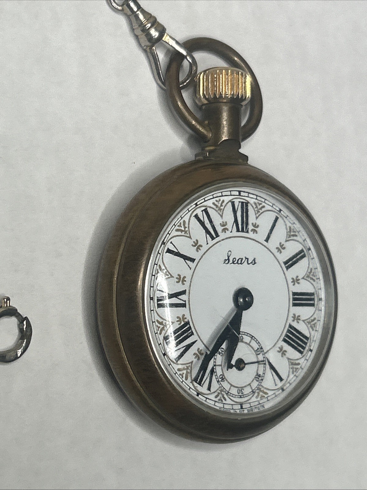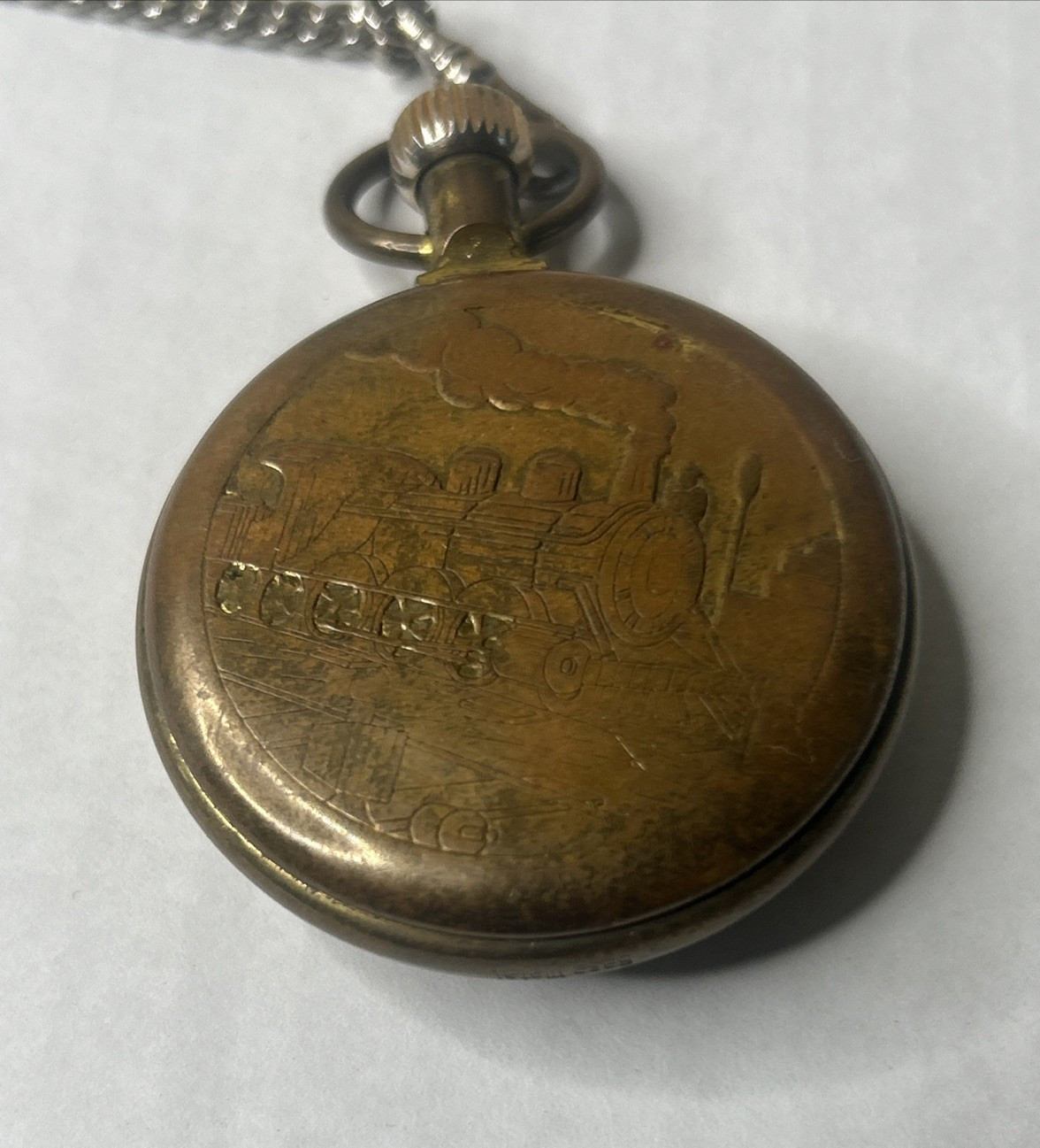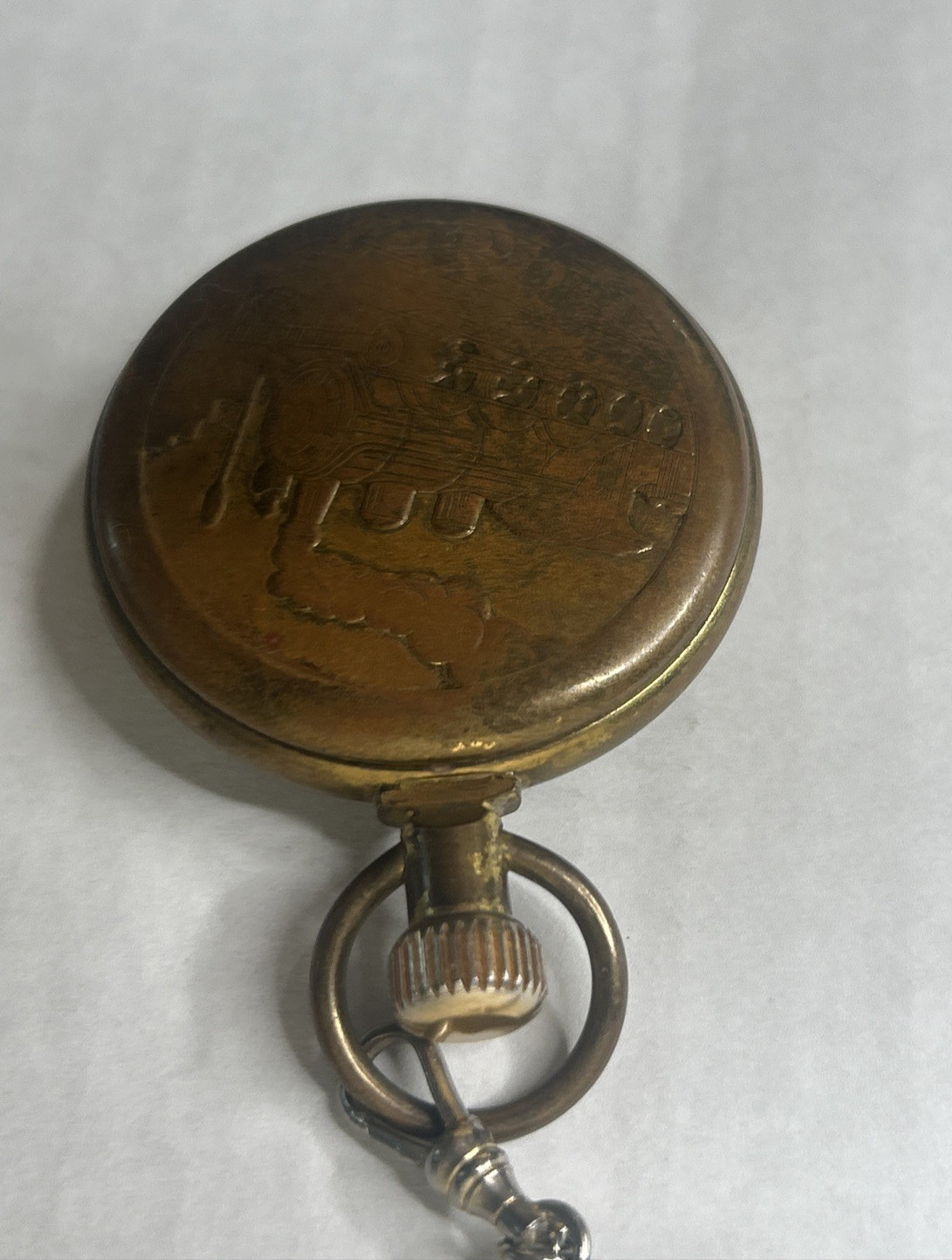 VINTAGE SEARS MECHANICAL WIND UP BRASS POCKET WATCH RAILROAD TRAIN LOCOMOTIVE