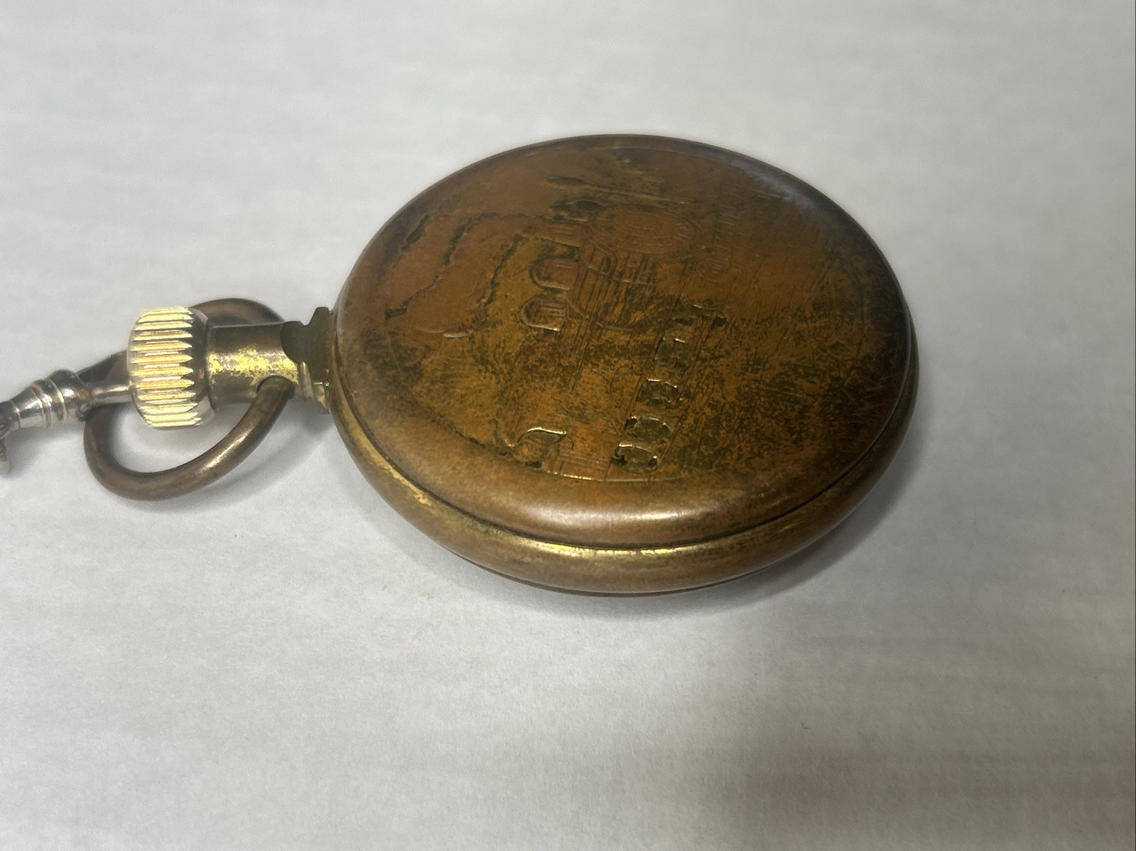 как выглядит VINTAGE SEARS MECHANICAL WIND UP BRASS POCKET WATCH RAILROAD TRAIN LOCOMOTIVE фото