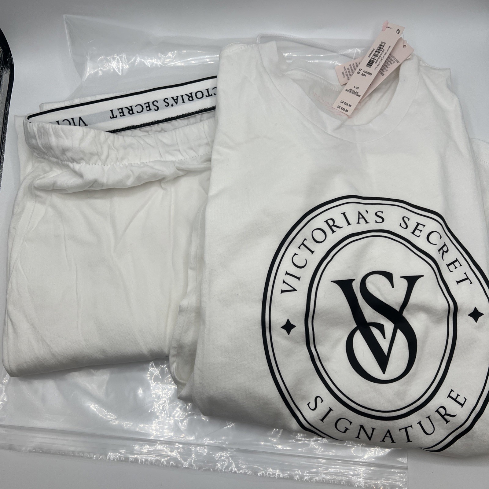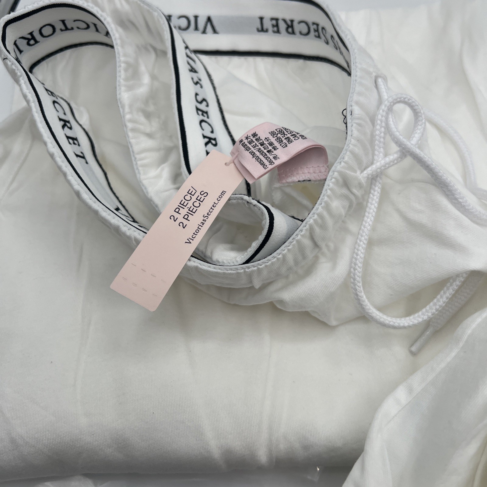 NEW Victoria's Secret 100 Cotton White Top Pants Black Logo Pajama/Jogger Set