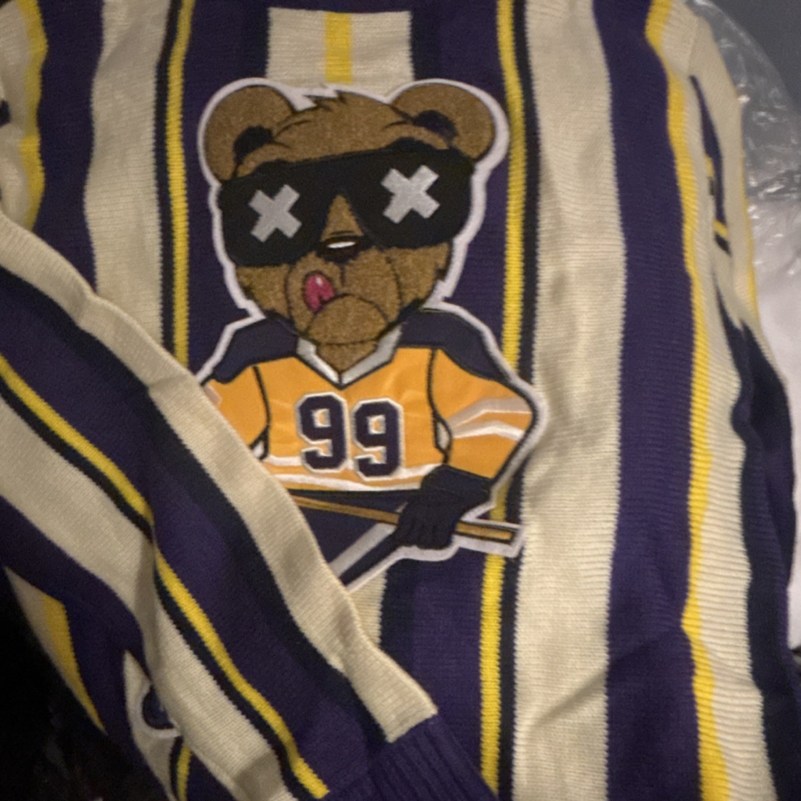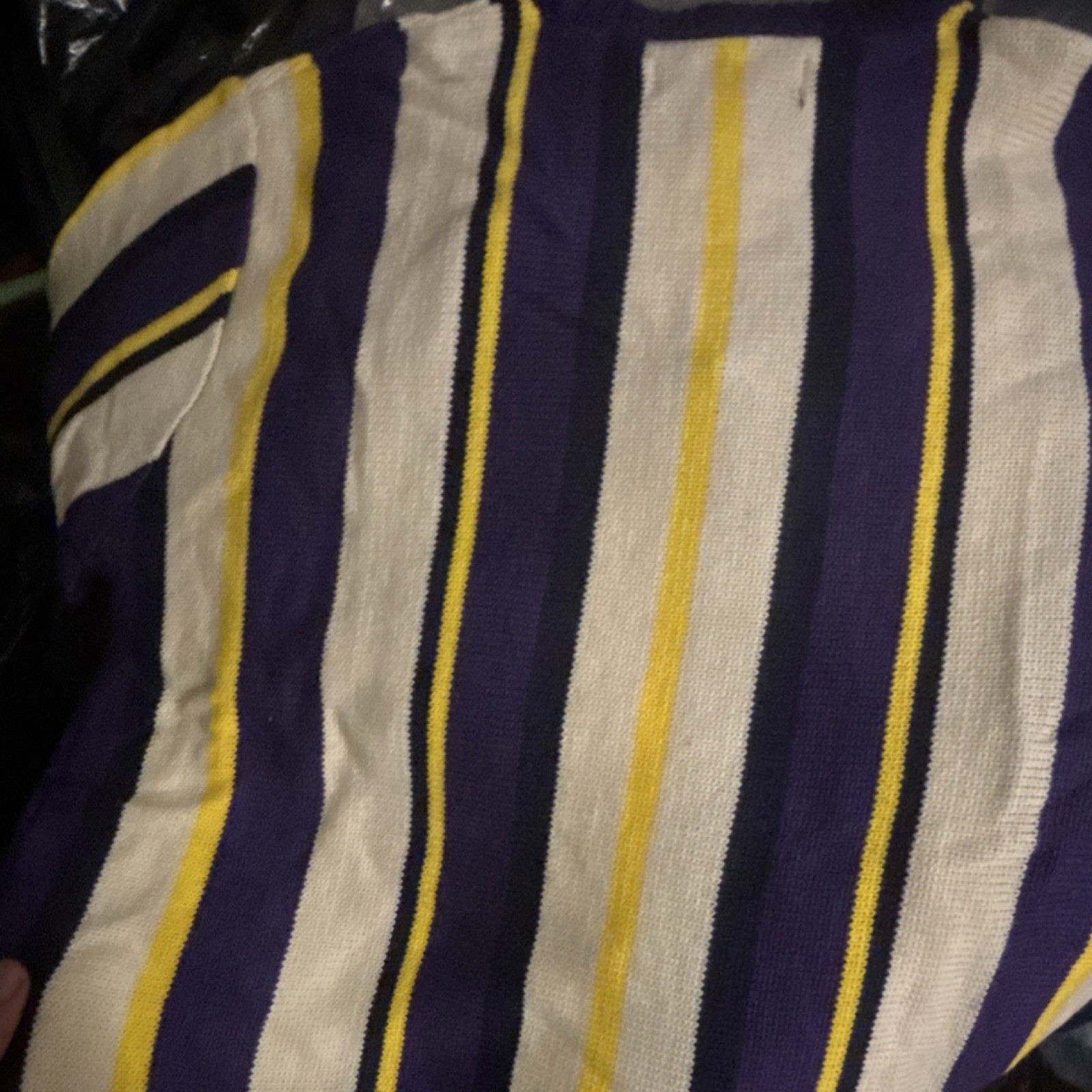 как выглядит Black Pike Mens Striped Hockey Graphic Pullover Sweater Purple Yellow фото