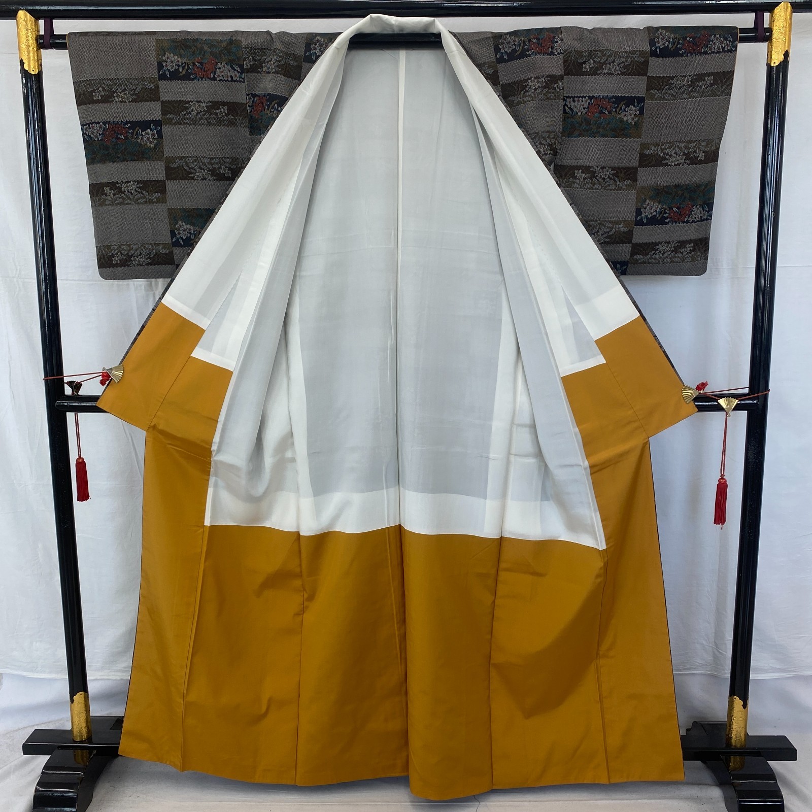 Japanese Vintage Kimono Silk Gray Tumugi Traditional Authentic Length 62in