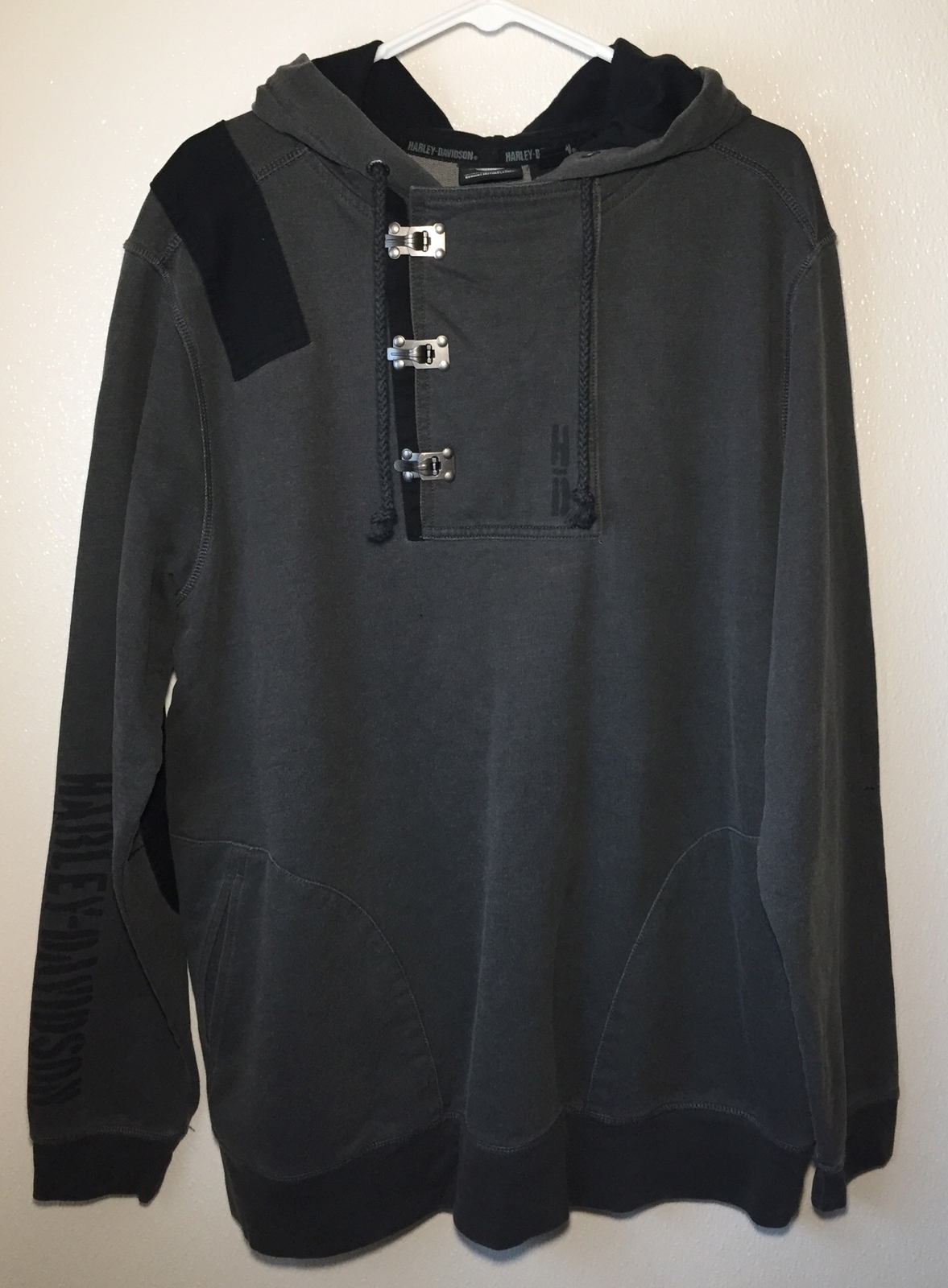 как выглядит Harley Davidson Pullover Skull Hoodie Size Large Gray Black Latch Collar Jacke фото