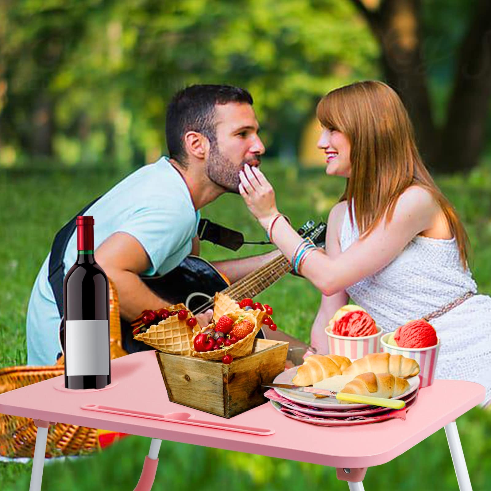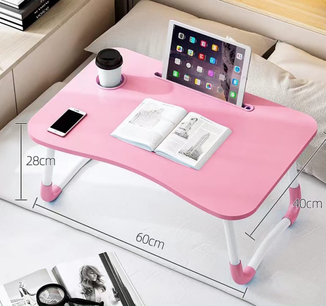 Foldable Laptop Bed Table w/ Drawer - Lap Desk w/ Phone Slot Cup Holder Pink