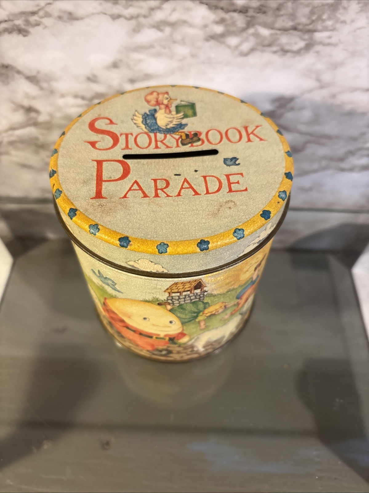 Vintage Storybook Parade Candy Tin Piggy Bank Nursery Mother Goose Characters