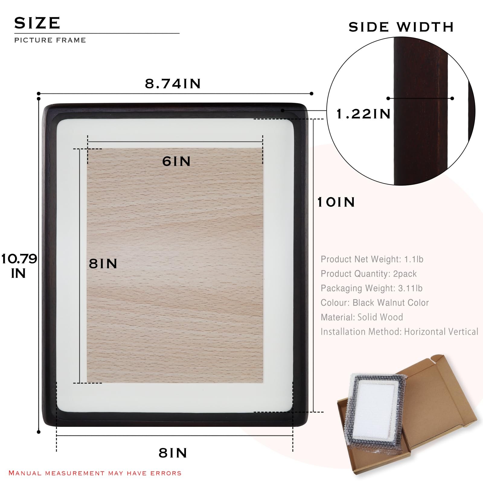 8x10 Wooden Picture Frame Set of 2, Display Pictures 6x8 with Mat or 8x10 Wit...