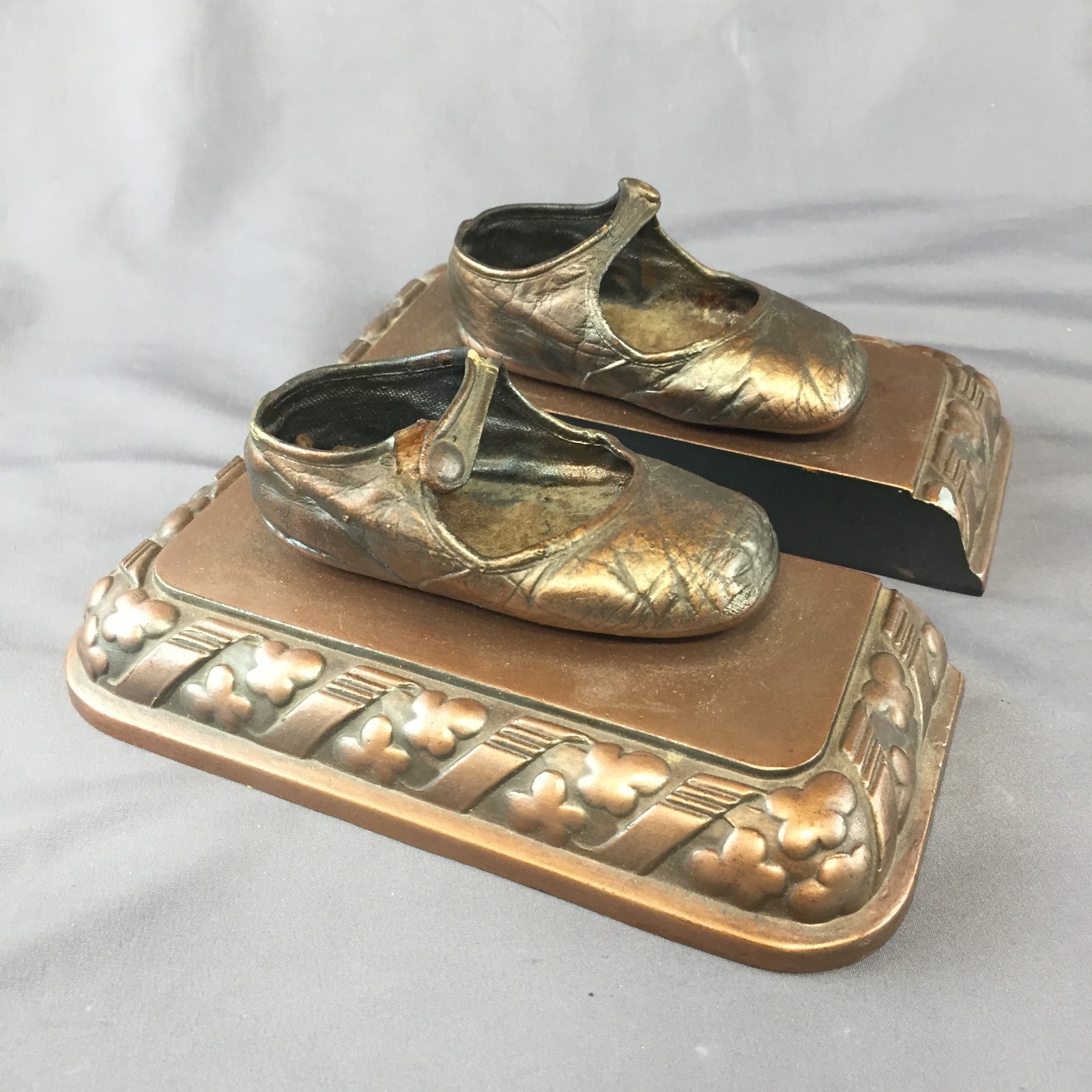как выглядит Vintage Pair of Bronzed Baby Shoes Mounted on Heavy Steel Bases / Bookends фото