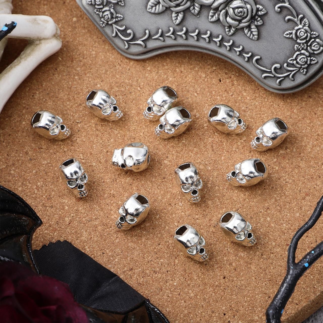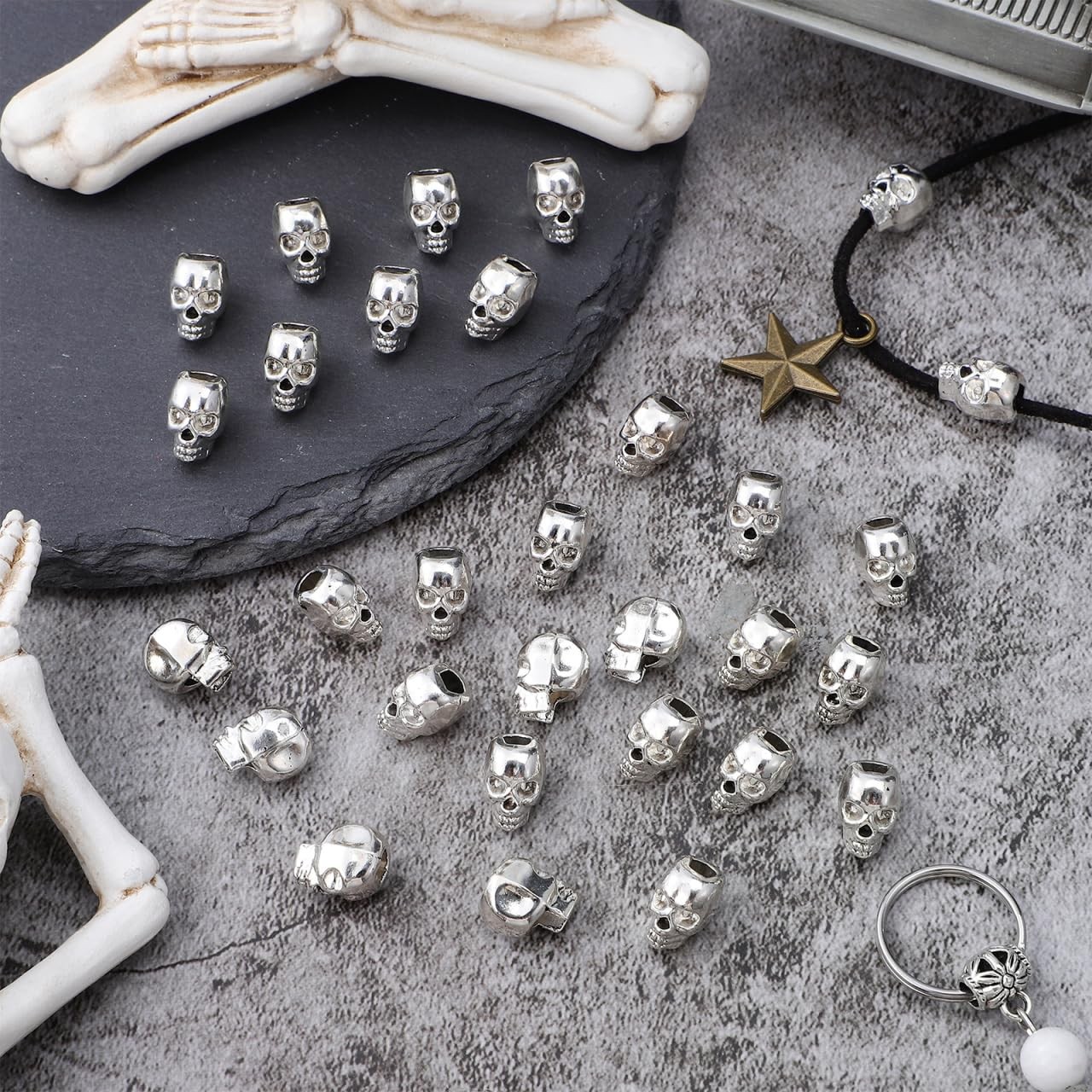 30Pcs Antique Silver Skull Head Metal Spacer Beads - Large Hole for Jewelry