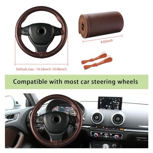 Genuine Leather Steering Wheel Cover, 15 Universal Car Full Hole Coffee